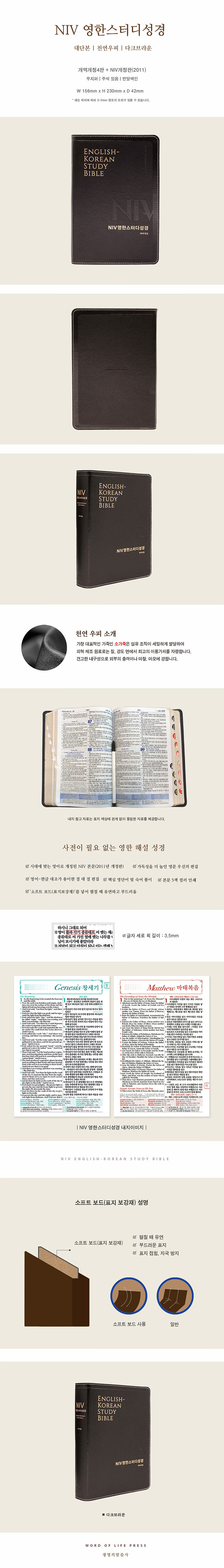 ½Ã´ë¿¡ ¸Â´Â ¿µ¾î·Î °³Á¤µÈ NIV °³Á¤ÆÇ(2011³â) º»¹®À» »ç¿ëÇÏ¿´´Ù. ÇÙ½É ¿µ´Ü¾î ¹× ¼÷¾î Ç®ÀÌ, °¡µ¶¼ºÀ» ´õ ³ôÀÎ ¿µ¹® ¿ì¼±ÀÇ ÆíÁý, ¿µ¾î-ÇÑ±Û ´ëÁ¶°¡ ÈξÀ ¿ëÀÌÇÑ Àý ´ë Àý ÆíÁý, º»¹® 5»ö Ä÷¯ Àμâ·Î ±¸¼ºÇÏ¿´´Ù. ¡®¼ÒÇÁÆ® º¸µå(Ç¥Áö º¸°Àç)¡¯¸¦ ³Ö¾î ÆîÄ¥ ¶§ À¯¿¬ÇÏ°í ºÎµå·´´Ù.