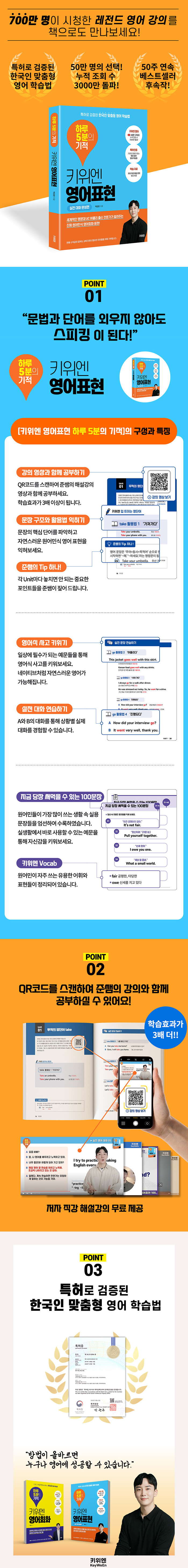Çб³¿¡¼ Ã¥À¸·Î ¹è¿î ¿µ¾îº¸´Ù´Â ½ÇÁ¦ ¹Ì±¹ÀÎµé »çÀÌ¿¡¼ »ç¿ëµÇ´Â ÁøÂ¥ ¿µ¾î°¡ ÇÊ¿äÇÕ´Ï´Ù. ¿ø¾î¹ÎµéÀº ªÀº ¹®ÀåÀ¸·Î ´ëÈÇÏ¸ç ½¬¿î ´Ü¾îµéÀ» Ȱ¿ëÇØ ¼ÒÅëÇÕ´Ï´Ù. ¡ºÅ°À§¿£ ¿µ¾îÇ¥Çö ÇÏ·ç 5ºÐÀÇ ±âÀû¡»Àº ¿ø¾î¹ÎµéÀÌ »ç¿ëÇÏ´Â ´Ù¾çÇÑ ¹®Àå Ç¥ÇöÀ» ÀÍÇô ½ÇÁ¦ »óȲ¿¡¼ ¿µ¾î·Î ´ëȰ¡ °¡´ÉÇÏ°Ô ÇØ ÁÖ´Â °Í¿¡ ÃÊÁ¡À» ¸ÂÃè½À´Ï´Ù. ÀÌ Ã¥Àº ¼ö¸¹Àº ºÐµéÀÌ ¸¶Ä§³» ¿µ¾î¿¡ ¼º°øÇß´ø ±× ±æ·Î ¿©·¯ºÐÀ» À̲ø¾î µå¸± °Ì´Ï´Ù. Á¤¸»·Î ³»°¡ ÇÏ°í ½ÍÀº ¸»ÀÌ ÀÔ¿¡¼ ³ª¿À´Â ³î¶ó¿î °æÇèÀ» ÇØ º¸½Ã±æ ¹Ù¶ø´Ï´Ù.