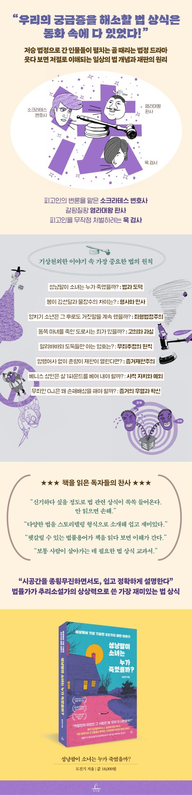 ÀÌ Ã¥Àº »ç¶÷µéÀÇ ±×·¯ÇÑ ¹Ù¶÷¿¡ ºÎÇÕÇÏ´Â ¡®°¡Àå ½¬¿î ¹ýÇÐ À̾߱⡯·Î¼ ¿À·§µ¿¾È »ç¶û¹Þ¾Æ¿Ô´Ù. ÀüÁ÷ ºÎÀåÆÇ»çÀÌÀÚ ÇöÁ÷ º¯È£»ç·Î¼ ¡´±×°ÍÀÌ ¾Ë°í ½Í´Ù¡µ ÀÇ ¹ý·ü ÀÚ¹®À» ¸Ã°í ÀÖ´Â Ã߸®¼Ò¼³ ÀÛ°¡ µµÁø±âÀÇ 2013³â ÀÛǰ ¡¶¼º³ÉÆÈÀÌ ¼Ò³à´Â ´©°¡ Á׿´À»±î?¡·°¡ 10³â ¸¸¿¡ »õ·Î¿î Ç¥Áö¿Í º»¹®À¸·Î ´Ù½Ã µ¹¾Æ¿Ô´Ù. ÀÌ Ã¥Àº ÇǰíÀÎÀÇ º¯·ÐÀ» ¸ÃÀº ¡®¼ÒÅ©¶óÅ×½º º¯È£»ç¡¯¿Í ÇǰíÀÎÀ» ¹«ÀÛÁ¤ ó¹úÇÏ·Á´Â ¡®¿í °Ë»ç¡¯, ±× »çÀÌ¿¡¼ °¥ÆÎÁúÆÎ °í¹ÎÇÏ´Â ¡®¿°¶ó´ë¿Õ ÆÇ»ç¡¯ °£ÀÇ °ø¹æÀ» ÅëÇØ ÀçÆÇ¿¡¼ °¡Àå Áß¿äÇÑ ¹ýÀÇ ¿øÄ¢À» 22°¡Áö À̾߱â·Î Èï¹ÌÁøÁøÇÏ°Ô Ç®¾î³½´Ù. µ¿È ¶Ç´Â ¿ª»ç ¼Ó Àι°µéÀ» Àú½Â ¹ýÁ¤¿¡ ºÒ·¯³»¾î, ±×µéÀÇ À¯¹«Á˸¦ °¡·Á³»¸é¼ Çö´ëÀÇ ¹ý °³³äÀ» ÄÚ¹ÍÇÑ ÅÍÄ¡·Î ¾Ë±â ½±°Ô ÇØ¼³ÇÏ´Â ÀÌ Ã¥Àº Ź¿ùÇÑ ¿Ï¼ºµµ¸¦ ÀÎÁ¤¹Þ¾Æ û¼Ò³â±³¾çµµ¼·Î ¼±Á¤µÇ´Â ¿µ¿¹¸¦ ¾ò±âµµ Çß´Ù.