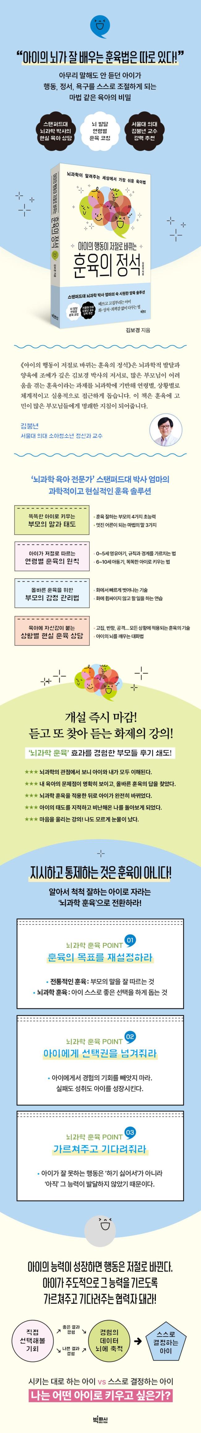 ÀúÀÚ´Â ÀÌ Ã¥¿¡¼ °°Àº ±ÔÄ¢ÀÌ¶óµµ ¿¬·É¿¡ µû¶ó, »óȲ¿¡ µû¶ó °¡¸£Ä¡´Â ¹æ¹ýÀÌ ´Þ¶óÁ®¾ß Çϸç, ¾ÆÀÌÀÇ ³ú°¡ Àß ¹è¿ì´Â ÈÆÀ°¹ýÀº µû·Î ÀÖ´Ù´Â »ç½ÇÀ» ³ú°úÇп¡ ±Ù°ÅÇØ ¸íÄèÇÏ°Ô Ç®¾î³½´Ù. ¾ÆÀÌ´Â ¡®¾ÆÁ÷¡¯ ´É·ÂÀÌ ¹ß´ÞÇÏÁö ¾Ê¾Ò°Å³ª, ¸ø ¹è¿ö¼, ¸ø ÇÏ´Â °Í»ÓÀÌ´Ù. ÀÌÇØ·Â°ú »ç°í·Â, °¨Á¤ Á¶Àý, ¹®Á¦ ÇØ°á, ÀÚ±â ÅëÁ¦ °°Àº ´É·ÂÀ» ¼ºÀå½ÃŰ¸é ¾ÆÀÌ´Â ÀúÀý·Î ´õ ÁÁÀº ÇൿÀ» ¼±ÅÃÇÏ°Ô µÈ´Ù. ¾ÆÀÌÀÇ ÇൿÀÌ µµ¹«Áö ÀÌÇØµÇÁö ¾Ê´Â°¡? ÈÆÀ°ÀÌ ¾î·Á¿ö ÁÂÀýÇÏ´Â ¼ø°£ÀÌ ÀæÀº°¡? ÈÆÀ°ÀÇ °üÁ¡À» ¿ÏÀüÈ÷ ¹Ù²ã³õÀ» ¡®°¡Àå °úÇÐÀûÀ̰í Çö½ÇÀûÀÎ À°¾ÆÀÇ ¼¼°è¡¯·Î Áö±Ý ¶°³ªº¸ÀÚ.