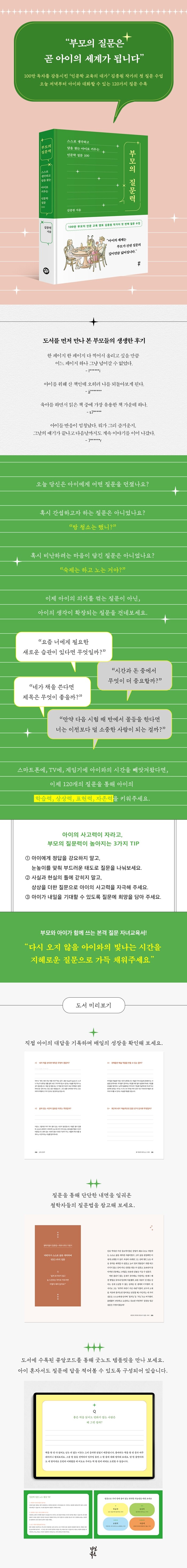 ÀÌ Ã¥¿¡¼ ±èÁ¾¿ø ÀúÀÚ´Â ÀÌ·± ºÎ¸ðµéÀÇ ¾î·Á¿òÀ» ÇØ°áÇϱâ À§ÇØ ¾ÆÀÌ¿Í ÁÖ°í¹ÞÀ» ¼ö ÀÖ´Â ¡®Àι®ÇÐ Áú¹® 100¡¯À» ¼±º°ÇØ ¼Ò°³ÇÕ´Ï´Ù. ´Ü¼øÈ÷ Áú¹®¸¸ ³ª¿ÇÏÁö ¾Ê°í ÇØ´ç Áú¹®À» ¾î¶² »óȲ¿¡¼ ¾î¶² ½ÄÀ¸·Î Ȱ¿ëÇϸé ÁÁÀ»Áö ±¸Ã¼ÀûÀÎ ÇØ¼³µµ ÇÔ²² ¼ö·ÏÇߴµ¥, ÀÌ´Â Àú¸¶´Ù ´Ù¸¥ ¾ÆÀÌÀÇ »îÀÇ Á¶°Ç¿¡ ¸ÂÃç ºÎ¸ð°¡ ´Ùä·Ó°í ÀÚÀ¯·Ó°Ô Áú¹®À» Ȱ¿ëÇÏ±æ ¹Ù¶ú±â ¶§¹®ÀÔ´Ï´Ù. Áú¹®ÀÇ °¡Áþ¼ö°¡ ¼¼»ó¿¡ Á¸ÀçÇÏ´Â ¾ÆÀÌ¿Í ºÎ¸ðÀÇ ¼ö¸¸Å dzºÎÇØÁú ¶§, ¾ÆÀ̵éÀº ±×µ¿¾È °¤Çô ÀÖ´ø ³»¸éÀÇ ¹®À» ¶Õ°í ³ª¿Í ¼¼»ó ¹ÛÀ¸·Î Æú¦ ¶Ù¾î¿À¸¦ °ÍÀÔ´Ï´Ù.