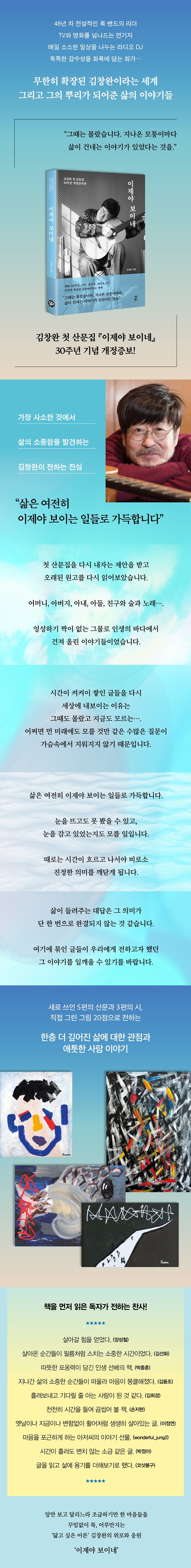 ±×·± ±×ÀÇ Ã¹ »ê¹®ÁýÀ» »õ ±Û 8Æí°ú ÀÛǰ 20Á¡À» ´õÇØ ´Ù½Ã ¼±º¸ÀδÙ. 1995³â ¡ºÁý¿¡ °¡´Â ±æ¡»·Î óÀ½ Ãâ°£µÇ°í, 2005³â ¡ºÀÌÁ¦¾ß º¸À̳ס»·Î ´Ù½Ã ¼±º¸ÀÎ ÈÄ 2025³â ´Ù½Ã µ¶ÀÚ¿Í ¸¸³ª´Â ÀÌ ±Û¿¡´Â ÀÚ¼¼ÇÏ°Ô µå·¯³»Áö ¾Ê¾Ò´ø ÀúÀÚÀÇ ³»¹ÐÇÑ »îÀÇ À̾߱â¿Í Áø¼ÖÇÑ »ý°¢µéÀÌ ´ã°Ü ÀÖ¾î »îÀ» ´ëÇÏ´Â ±×ÀÇ Åµµ°¡ ¿À·ÔÀÌ ÀüÇØÁø´Ù. °úÀåµµ ¹Ìȵµ ¾øÀÌ ´ý´ýÇÏ°Ô »îÀ» ´ã¾Æ³»´Â ³ë·§¸», ´Ü ÇÏ·çµµ °Å¸£Áö ¾Ê°í dz°æ°ú ¸¶À½°¡ÁüÀ» ±â·ÏÇÑ ¿ÀÇÁ´× ¸àÆ®¿¡¼ ¸¹Àº »ç¶÷ÀÌ Å« À§·Î¿Í °¨µ¿À» ¹Þ¾Ò´ø °Íó·³, À̹ø ¡ºÀÌÁ¦¾ß º¸À̳ס»¿¡ ´ã±ä ±×ÀÇ ¾ÆÁÖ °³ÀÎÀûÀÎ ±â·Ï ¶ÇÇÑ ¿ì¸®ÀÇ ¸¶À½À» ¾î·ç¸¸Áø´Ù.