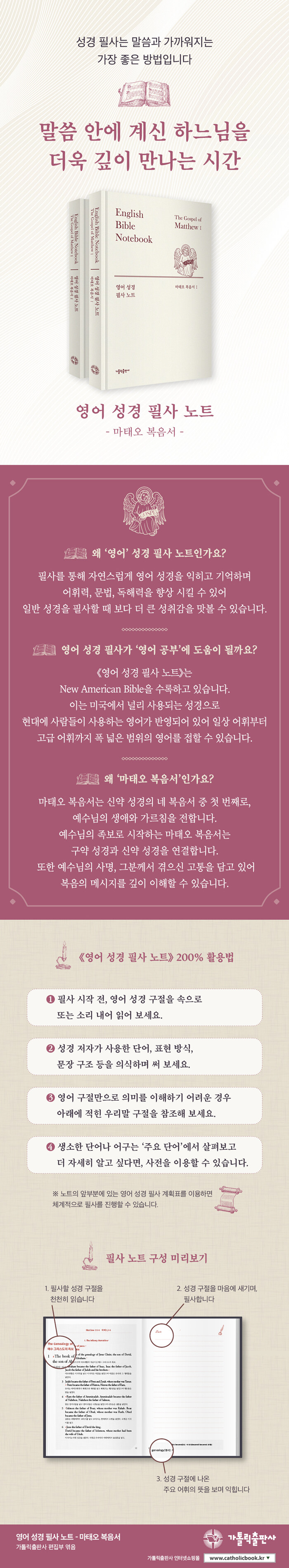¼º°æ ¸»¾¸À» ¼ÕÀ¸·Î Á÷Á¢ ¾²´Â ¡®¼º°æ Çʻ硯´Â ÇÏ´À´ÔÀÇ ¸»¾¸À» ±í°Ô ¹¬»óÇÏ´Â ½Å¾ÓÀû ½ÇõÀÇ ÇÑ ¹æ¹ýÀÌ´Ù. ÃÖ±Ù¿¡´Â ´Ü¼øÈ÷ Àд °ÍÀ» ³Ñ¾î Á÷Á¢ ÇÊ»çÇÏ¸ç ±íÀÌ ÀÖ´Â µ¶¼¸¦ ÇÏ´Â ¹®È°¡ Áö¼ÓµÇ°í ÀÖ´Ù. ÀÌ·¯ÇÑ È帧 ¼Ó¿¡¼ µ¶ÀÚµéÀÇ Å« »ç¶ûÀ» ¹Þ°í ÀÖ´Â ¡¶¿µ¾î ¼º°æ ÇÊ»ç ³ëÆ®¡· ½Ã¸®ÁîÀÇ ¼¼ ¹øÂ° Ã¥, ¡¶¿µ¾î ¼º°æ ÇÊ»ç ³ëÆ®-¸¶Å¿À º¹À½¼¡·°¡ Ãâ°£µÇ¾ú´Ù. À̹ø ¸¶Å¿À º¹À½¼´Â µ¶ÀÚµéÀÇ ÀǰßÀ» ¹Ý¿µÇÏ¿© Çʻ簡 Æí¸®ÇÑ µÎ²²ÀÇ Ã¥ µÎ ±ÇÀ¸·Î ³ª´©¾î Á¦ÀÛÇß´Ù.