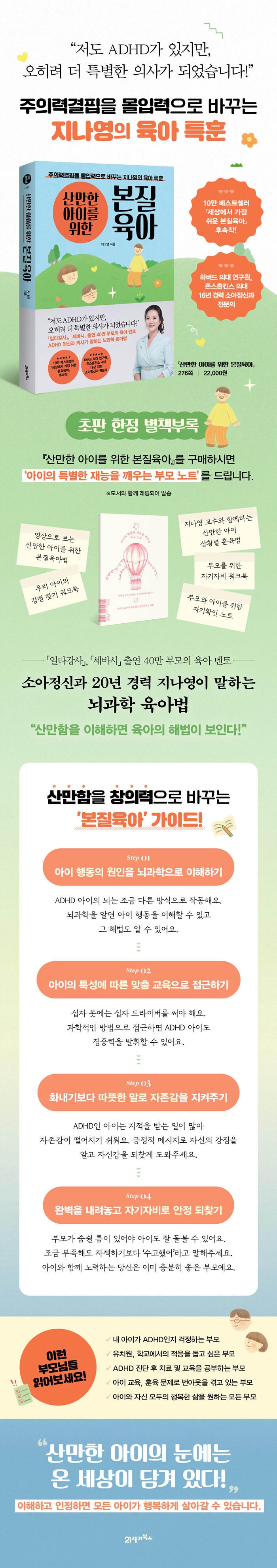 ¡º»ê¸¸ÇÑ ¾ÆÀ̸¦ À§ÇÑ º»ÁúÀ°¾Æ¡»´Â ÁÖÀǰ¡ Èð¾îÁö´Â ¾ÆÀ̸¦ ¡®ÁýÁßÀÇ ¼³°èÀÚ¡¯·Î Ű¿ì´Â, Áö³ª¿µ ±³¼öÀÇ ³ú°úÇÐ À°¾Æ Æ¯ÈÆ¼´Ù. 20³â °æ·Â ¼Ò¾ÆÁ¤½Å°ú Àü¹®ÀÇÀÌÀÚ ADHD ´ç»çÀÚÀÎ ÀúÀÚ Áö³ª¿µÀº ¡°»ê¸¸ÇÔÀº °íÃÄ¾ß ÇÒ °áÇÔÀÌ ¾Æ´Ï¶ó ¼³°èÇØ¾ß ÇÒ °¡´É¼º¡±À̶ó°í ¸»ÇÑ´Ù. ¾ÆÀÌÀÇ ÁÖÀÇ·Â, Ãæµ¿¼º, °èȹ·Â ºÎÁ·À» ´Ü¼øÇÑ ÈÆÀ°ÀÇ ¹®Á¦°¡ ¾Æ´Ï¶ó ³ú°¡ Á¤º¸¸¦ ó¸®ÇÏ°í ¹ÝÀÀÇÏ´Â ¹æ½ÄÀÇ Â÷ÀÌ·Î ÀÌÇØÇϰí, À̸¦ ÀÏ»ó ¼Ó ½Çõ Àü·«À¸·Î ¹Ù²Ù´Â ¹æ¹ýÀ» ±¸Ã¼ÀûÀ¸·Î Á¦½ÃÇÑ´Ù.