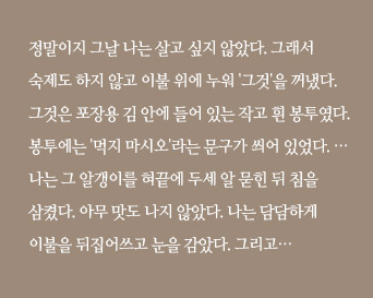 ´ÙÀ½³¯ ¾ÆÄ§ ³ª´Â ¾Æ¹« ÀÌ»óÀÌ ¾ø¾ú´Ù. '±×·¡~ ±×°Í¸Ô°í Á×À»¸®°¡¾øÁö' ¾î´À¶§¿Í °°Àº Áö¿Á°°Àº ÇϷ縦 Áö³»±â À§ÇØ ¾Ä°í Áý¹ÛÀ» ³ª¿ÔÀ»¶© Ǫ¸¥µéÆÇÀ» ¸¶ÁÖÇÒ ¼ö ÀÖ¾ú´Ù. ²ÞÀ» ²Ù´ÂÁÙ ¾Ë°í º¼À» ²¿Áý¾îºÃ´Âµ¥ ¿ª½Ã ¾ÆÇÁÁö ¾Ê¾Ò´Ù. '¿ª½Ã ²ÞÀ̳×..' Ǫ¸¥µéÆÇÀº »ç¹æÀÌ Àýº®À¸·Î ÀÌ·ç¾îÁ®ÀÖÀ¸¸ç ¾Æ¹«µµ ¾ø¾ú°í ¾Æ¹«¸® ½Ã°£ÀÌ Áö³ªµµ ±× ´©±¸µµ ¸¸³¯ ¼ö ¾ø¾ú´Ù. ¶ÇÇÑ ¾Æ¹«°Íµµ ¸ÔÁö¾Ê¾Æµµ ¹è°íÇÄÀ» ´À³¢Áö ¸øÇß´Ù. 'ÀÚÀ¯·Î¿î¼¼»ó!' ÇÏÁö¸¸ ¸¶À½ Çѱ¸¼®¿£ ¹º°¡ Ç¥ÇöÇÒ ¼ö ¾ø´Â ¼¿îÇÔ, ¾Æ½¬¿ò, ºÐ³ë, ½½ÇÄ °°Àº °¨Á¤µéÀÌ µÚÁ×¹ÚÁ× ¼¯¿©ÀÖ¾ú´Ù. 3ÀÏ Á¤µµ Áö³µÀ» ¶©, ¸¶À½ Çѱ¸¼®¿¡ ÀÖ´ø µÚÁ×¹ÚÁ×ÇÑ °¨Á¤µéÀÌ Ä¿Áö°í ¶Ç Ä¿Áö°í °è¼Ó Ä¿Áö´õ´Ï ³» ¸¶À½À» Áý¾î »ïÄ×´Ù. 'Â÷¶ó¸® Á×°í¸»Áö..' ³ª´Â ²Þ¼Ó¿¡¼ ÀÚ»ìÀ» »ý°¢Çß°í Àýº®À§¿¡ ¿Ã¶ú´Ù. ±×¸®°í ¸Á¼³ÀÓ ¾øÀÌ ¶³¾îÁ³´Ù. Àýº®¿¡¼ ¶³¾îÁú¶§ ±ú´ÞÀ½À» ¾ò¾ú´Ù. ³» ÀÚ½ÅÀ» Á×ÀÌ´Â °Í º¸´Ù´Â ³» ÀÚ½Å¼Ó ³ª¸¦ ±«·ÓÈ÷´Â °¨Á¤À» Á×À̴°ÍÀÌ ¿Ç´Ù´Â °ÍÀ»..