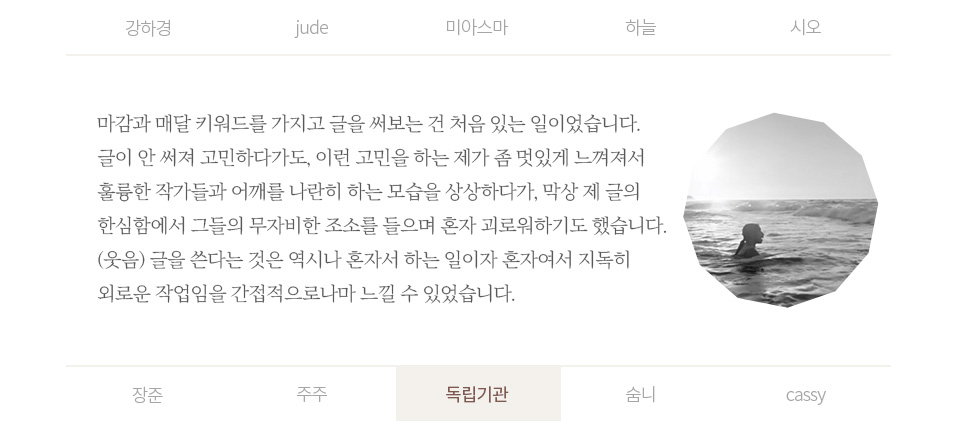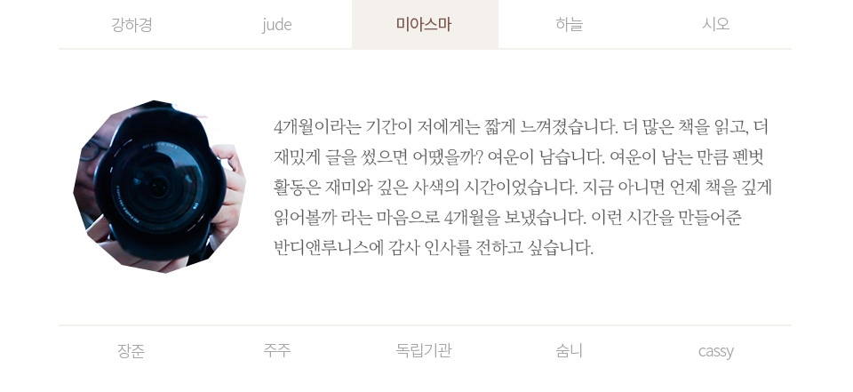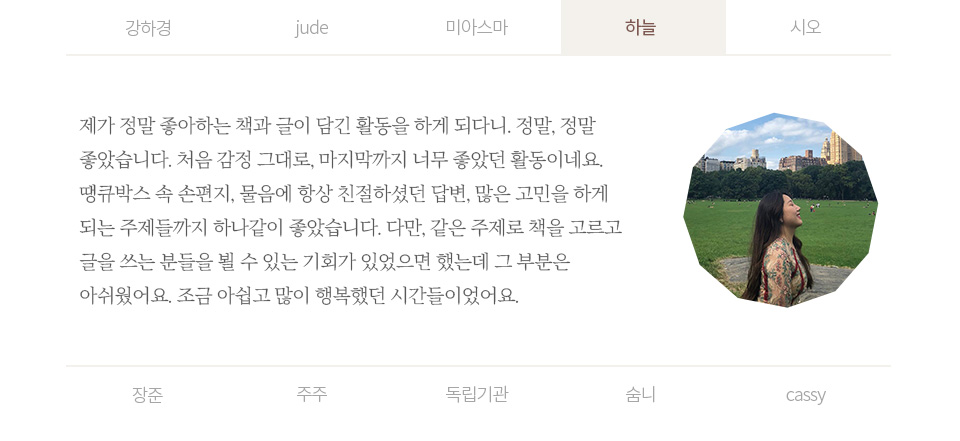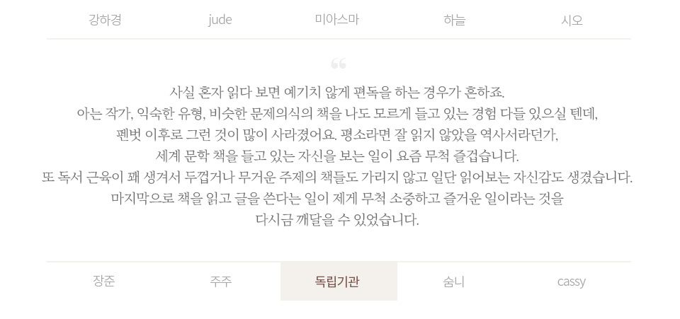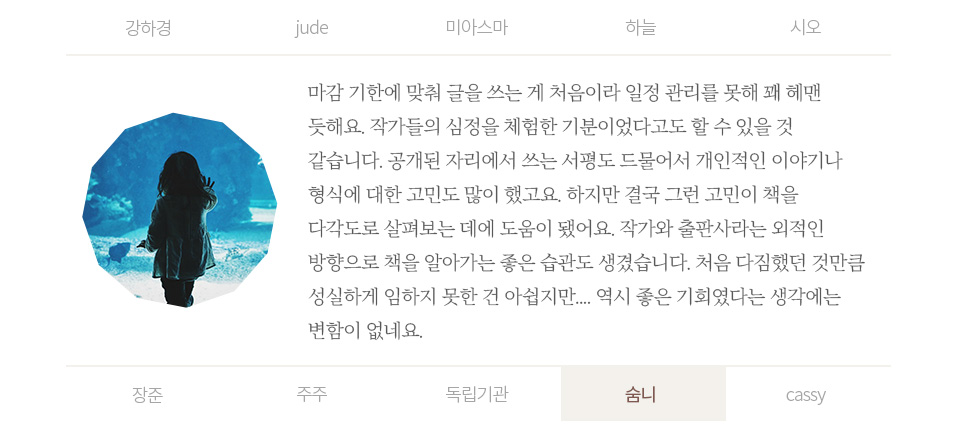- ÀÌ Ã¥Àº Ȱ¹ßÈ÷ Ȱµ¿ÇÏ´Â ÀÛ°¡µéÀÇ ÂªÀº »ê¹®À» ´ã¾Æ ¿«¾î³½ ¡®Âª¾Æµµ ±¦Âú¾Æ¡¯ ½Ã¸®ÁîÀÇ ³× ¹øÂ°ÀÔ´Ï´Ù. ÀÌ ½Ã¸®ÁîÀÇ ÁÖÁ¦´Â µ¿¹°±ÇÀ̾ú½À´Ï´Ù. µ¿¹°±ÇÀ̶õ µ¿¹°µéÀÌ »ç¶÷°ú ¸¶Âù°¡Áö·Î °íÅë ¹ÞÁö ¾Ê´Â ȯ°æ¿¡¼ »ì¸ç, ¼ö´ÜÀ¸·Î¼ ±× »ý¸íÀÌ ÀÌ¿ëµÇÁö ¾ÊÀ» ±Ç¸®¸¦ ¶æÇÕ´Ï´Ù. ±¸º´¸ð ¿Ü 15¸íÀÇ ÀÛ°¡µéÀº ÀÌ µ¿¹°±ÇÀ» ÁÖÁ¦·Î ´Ù¾çÇÑ ¾ê±âµéÀ» Ç®¾î³»¾ú½À´Ï´Ù.