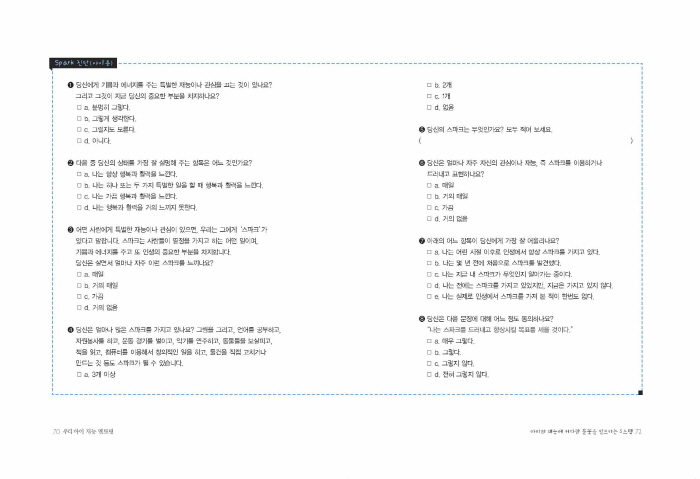 ¿ì¸®°¡ ºÎ¸ð·Î¼ ÇØ¾ß ÇÒ ÀÏÀº, ¾ÆÀ̰¡ ÀÚ½ÅÀÇ ¼ûÀº Àç´É, ½ºÆÄÅ©¸¦ ¹ß°ßÇϵµ·Ï µµ¿ÍÁÖ°í °è¼Ó Àϱú¿ö ±æ·¯ ÁÖ¸ç, Ȱ¦ ²ÉÇÇ¿ï ÀÚ¸®¸¦ ¸¶·ÃÇÏ´Â °ÍÀÌ´Ù. ºÎ¸ð·Î¼ ¿ì¸®°¡ ÇÒ ¼ö ÀÖ´Â ÃÖ¼±ÀÇ ÀÏÀº, ¾ÆÁ÷ ½Ã°£ÀÌ ÀÖÀ» ¶§ ¾ÆÀÌÀÇ ¾î±ú¸¦ ¾È¾Æ ÁÖ´Â °ÍÀÌ´Ù. ¾î±ú¸¦ ¾È¾Æ ÁÖ¸ç ¡°³ ³Î ¹Ï¾î.¡±¶ó°í ¸»ÇÏ´Â °ÍÀÌ´Ù. _____100p