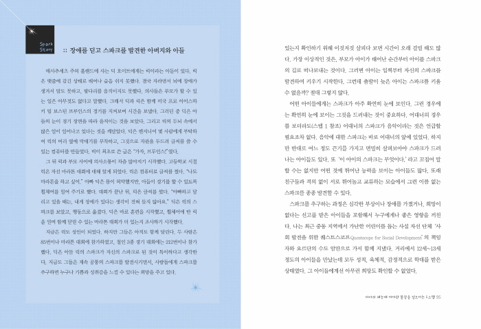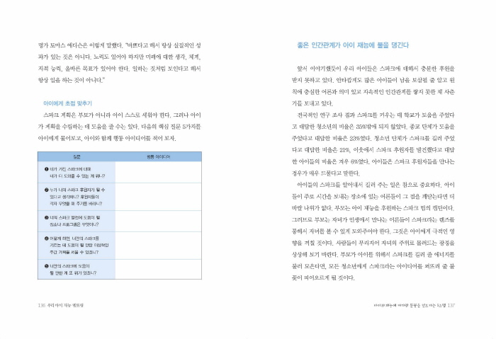 ´çÀåÀº ¾ÆÀÌ¿¡°Ô Àç´É Áï, ½ºÆÄÅ©°¡ ¾ø´Â °Íó·³ º¸¿©µµ ºÎ¸ð´Â Ç×»ó ½ºÆÄÅ©ÀÇ ¹ß°ßÀ» °Ý·ÁÇÏ°í ºÏµ¸¿ï ȯ°æÀ» ¸¸µé¾î ÁÖ´Â °ÍÀÌ Áß¿äÇÏ´Ù. ¾î¶² Áý¿¡´Â °øÀ̳ª ´Ù¸¥ ¿îµ¿ ±â±¸µéÀÌ ¸¹¾Æ¼ ¾ÆÀ̰¡ ½±°Ô ¸¸Áö°í °¡Áö°í ³î ¼ö ÀÖ´Ù. ¶Ç ¾î¶² °¡Á¤¿¡´Â ¹Ì¼ú¿ëǰÀ̳ª µµ¼°ü ´ëÃâ Ä«µå¸¦ º¸°üÇÏ´Â Àå¼Ò, »ý°¢Çϱâ ÁÁÀº Àå¼Ò°¡ Àֱ⵵ ÇÏ´Ù. ¸ÅÁÖ ¶Ç´Â ¸Å´Þ Á¤±âÀûÀ¸·Î ÇÔ²² ½Ã°£À» º¸³»¸é¼ ÀÚ¿øºÀ»ç³ª Ã౸, ÆÛÁñ ¸ÂÃ߱⸦ Çϰųª °æÄ¡ ÁÁÀº °÷À¸·Î ³ªµéÀ̸¦ °¡°í À½¾Çȸ¿¡ °¡´Â °èȹÀ» ¼¼¿ö ½ÇõÇÏ´Â °¡Á·µµ ÀÖ´Ù. ÀÌ·± ȯ°æÀº ´çÀåÀº º° ¼º°ú¸¦ º¸ÀÌÁö ¸øÇÏ´õ¶óµµ ¾ÆÀ̰¡ ÀÚ¶ó¸é¼ ºÐ¸íÈ÷ ½ºÆÄÅ©¸¦ ÀÏÀ¸Å³ ºÒ¾¾°¡ µÈ´Ù. _____89p