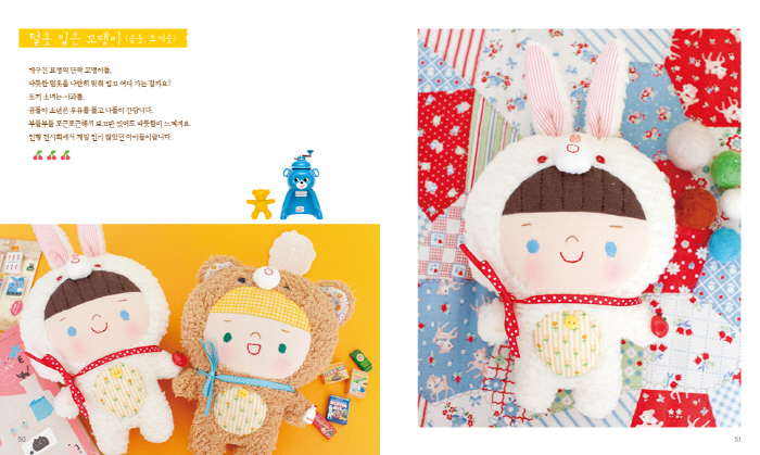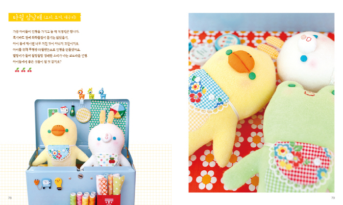 ÀÚ½ÅÀÌ Á÷Á¢ µðÀÚÀÎÇÑ Ä³¸¯Å͸¦ Çö½Ç¿¡¼ ¸¸³¯ ¼ö ÀÖ´Â ¹æ¹ýÀ» °í¹ÎÇÏ´Ù ÀÎÇüÀ» ¸¸µé±â ½ÃÀÛÇß´Ù. ÀÌÈÄ Á÷Á¢ ¸¸µç ±Í¿©¿î ij¸¯ÅÍ ÀÎÇü°ú ¼ÒǰÀ» µé°í È«´ë ÇÁ¸®¸¶ÄϱîÁö ÁøÃâÇØ ¡®¾î¸Ó³ª, ±Í¿©¿ö!¡¯¶ó´Â °¨Åº»ç¸¦ ¹é¸¸ ¹ø Âë µéÀ¸¸ç °á±¹ ÀÎÇü µðÀÚÀ̳ʷμ ÀÚ¸®¸¦ ±»Çû´Ù. ¡°±Í¿©¿î °ÍÀÌ ÃÖ°í!¡±¶ó´Â ¸ðÅä¿¡ °É¸Â°Ô ÀÎÇüµµ, ÀÏ·¯½ºÆ®µµ, ½ÉÁö¾î ¸íÇÔ Çϳª±îÁöµµ ÅåÅå Æ¢´Â °¨°¢À» ÀÚ¶ûÇÏ¸ç ¼Ò³à °¨¼ºÀ» À¯ÁöÇϰí ÀÖ´Ù. µ¶ÀÚ¿¡°Ôµµ ÀÌ ¸¶À½ÀÌ Àü´ÞµÇ¾úÀ¸¸é ÇÏ´Â ¹Ù¶÷À¸·Î ÀÌ Ã¥¿¡ ³ª¿Â ±Û, »çÁø, ÀÏ·¯½ºÆ® ¹× µðÀÚÀÎ ÀÛ¾÷À» ¸ðµÎ µµ¸Ã¾Ò´Ù. Ã¥ÀÇ ¾î´À ÆäÀÌÁö¸¦ ÆîÄ¡µç ¡°±Í¿±´Ù~!¡±¶ó´Â °¨ÅºÀÌ ³ª¿Â´Ù¸é ±×³àÀÇ ÀÛÀüÀÌ ¼º°øÇÑ ¼À.