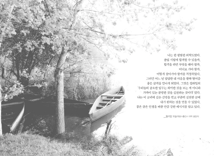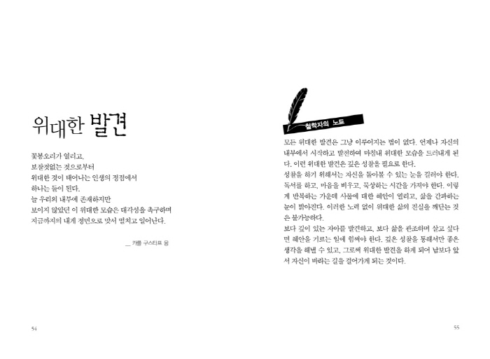 º¸´Ù ±íÀÌ ÀÖ´Â ÀھƸ¦ ¹ß°ßÇϰí, º¸´Ù »îÀ» °üÁ¶ÇÏ¸ç »ì°í ½Í´Ù¸é Çý¾ÈÀ» ±â¸£´Â ÀÏ¿¡ Èû½á¾ß ÇÑ´Ù. ±íÀº ¼ºÂûÀ» ÅëÇØ¼¸¸ ÁÁÀº »ý°¢À» ÇØ³¾ ¼ö ÀÖ°í, ±×·Î½á À§´ëÇÑ ¹ß°ßÀ» ÇÏ°Ô µÇ¾î ³²º¸´Ù ¾Õ¼ ÀÚ½ÅÀÌ ¹Ù¶ó´Â ±æÀ» °É¾î°¡°Ô µÇ´Â °ÍÀÌ´Ù.