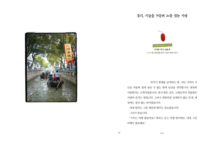 »ç¶ûÇÏ´Â »ç¶÷ÀÌ ÀÖ³ª¿ä? ±×·¸´Ù¸é ´ç½Å¿¡°Ô °¡Àå ÇູÇÑ ¼±¹°Àº ´ç½ÅÀÇ ±×´ë¿Í ÇÔ²² ¶°³ª´Â ¿©ÇàÀÏ °ÍÀÔ´Ï´Ù. (¡¦¡¦) ±×·¯³ª ¿©ÇàÀº ÀÚÁÖ ¿ì¸®¸¦ ¹è½ÅÇÕ´Ï´Ù. ±â´ëÇÏ°í ¶°³ ¿©ÇàÀÌ ½Ç¸ÁÀ» Áá´ø ¼ö¸¹Àº °æÇèÀÌ ¶°¿À¸¨´Ï´Ù. »ç¶÷µé°ú ºÎµúÈ÷°í ³¡¾øÀÌ ¼Òºñ¿¡ ³ëÃâµÇ°í °è¼ÓÇØ¼ À̵¿ÇØ¾ß ÇÏ´Â ¹æ½ÄÀÇ ¿©Çà¿¡ ¿¬ÀÎÀ» ÃÊ´ëÇÒ ¼ö´Â ¾ø½À´Ï´Ù. (¡¦¡¦) ¿¬Àΰú ÇÔ²² ¼¶À¸·Î ÇâÇÑ´Ù´Â °ÍÀº ±×ÀÌ¿Í ¼ÕÀâ°í ¾ÖÃÊÀÇ Æòȸ¦ ã¾Æ ¿©ÇàÀ» ¶°³´Ù´Â °ÍÀ» ÀǹÌÇÕ´Ï´Ù. ºÐÁÖÇÑ ¼ÒºñÀÇ ¿©ÇàÁöµéÀ» ¹°¸®Ä¡°í µÑ¸¸ÀÇ ÆòÈ·Î¿î °ø°£À» ã¾Æ ¿ÂÀüÈ÷ º¸È£¹Þ°í ¿Â´Ù´Â °ÍÀ» ÀǹÌÇÕ´Ï´Ù. (¡¦¡¦) ¼¶¿¡ °¤Èù ¿¬ÀÎÀÌ µÇ¾î ¼·Î¸¦ ¹Ù¶óº¾´Ï´Ù. Æó¼â. ±×·¯³ª ´õ¾øÀÌ Æòȷοî. ÀÌ Á¶¿ëÇÑ °ø°£ ¼Ó¿¡¼ ³ª´Â Áö±Ý ±×´ë¿Í ÇÔ²² ÀÖ½À´Ï´Ù. ³î¶ó¿ï ¸¸Å ÇູÇÕ´Ï´Ù. ±×´ë·Î °¡µæÇÑ °ø°£À̴ϱî. <ÀÚ¿ùµµ, ´ç½ÅÀÇ ±×´ë¸¦ À§ÇÑ ¿©Çà> Áß¿¡¼