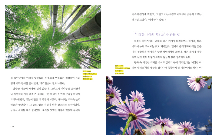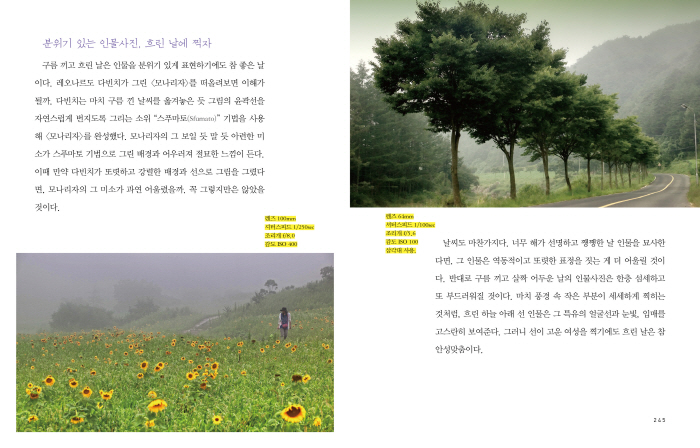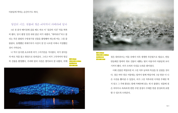 ÇØ°¡ Áø µÚ 30ºÐ°¡·®ÀÌ ¿Ö Áß¿äÇÒ±î. ±×¶§ÀÇ ÇϴúûÀÌ ¾î¶²Áö ¶°¿Ã·Áº¸¸é ´äÀ» ¾Ë ¼ö ÀÖÀ» °ÍÀÌ´Ù. (Áß·«) À̶§ »çÁøÀ» ÂïÀ¸¸é ¾îµÏ¾îµÏÇÑ Àú³áÀÇ ºÐÀ§±â´Â ¹°·Ð ¹Ì¼¼ÇÑ µµ½ÉÀÇ ÀÜ»óÀ» ¸ðµÎ ÂïÀ» ¼ö ÀÖ´Ù. ÇѰÀ» Âï´Â´Ù¸é ¾îµÏÇÑ Çϴðú µµ½ÉÀÇ ºÒºû, °¹° Ç¥¸é±îÁö °í½º¶õÈ÷ ´ã¾Æ³¾ ¼ö ÀÖ´Â ¶§´Ù. À̶§¸¦ ³õÄ¡¸é ¾Ö¼®ÇϰԵµ ¹ã dz°æÀº ¾îµÒ¿¡ ¾Æ¿¹ Àá°Ü¹ö·Á Âï±â ¾î·Á¿öÁø´Ù. _2ºÎ Áß <¾ß°æ »çÁø¿¡µµ ¡®È²±Ý ½Ã°£¡¯ÀÌ ÀÖ´Ù> p.117~119 ÁÖ·èÁÖ·è Èê·¯³»¸®´Â ºø¹°°ú Áö³ª°¡´Â »ç¶÷À» ÇÔ²² Ä«¸Þ¶ó¿¡ ´ã´Â °Ç °¡Àå ¹«³ÇÏ°í °íÀüÀûÀÌÁö¸¸, ±×·¡µµ ¿¹»Ú°í È¿°úÀûÀ¸·Î ºñ ¿À´Â dz°æÀ» ÂïÀ» ¼ö ÀÖ´Â ¹æ¹ýÀÌ´Ù. À̶§ Ç÷¡½Ã¸¦ ÅͶ߸®¸é À¯¸®Ã¢¿¡ ºûÀÌ ¹Ý»çµÇ¾î ÇϾé°Ô ³ª¿À´Ï Ç÷¡½Ã´Â ¹Ýµå½Ã ²¨³õÀ» °Í. _3ºÎ Áß <ºñ, ÃËÃËÇÑ Áú°¨ÀÇ ½Ã°£> p.185 ¾Æ¹«·¡µµ È帰 ³¯¿£ ÇÏ´ÃÀÌ ¾îµÓ´Ùº¸´Ï ³ëÃâÀÌ Àû°Ô ³ª¿Â´Ù. ±×¸¸Å »çÁøÀÌ ½±°Ô Èçµé¸± ¼ö ÀÖ´Ù. ÂïÀ» ¶§ Èçµé¸®Áö ¾Êµµ·Ï Áß½ÉÀ» Àß Àâ°í ÁöÇüÁö¹°¿¡ ±â´ë¾î Âï°Å³ª »ï°¢´ë¸¦ ÀÌ¿ëÇÒ °ÍÀ» ±ÇÇÑ´Ù. ¶Ç ÇÇ»çü¸¦ Àß Ç¥ÇöÇϱâ À§Çؼ± °¨µµ¸¦ »ì¦ ³ô¿©ÁÖ´Â °Ô ÁÁ°Ú´Ù. _4ºÎ Áß <È帰 ³¯Àº »çÁø Âï±â °¡Àå ÁÁÀº ³¯> p.246