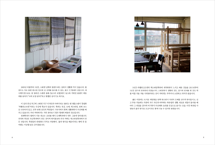 ºÎµå·´°í µû¶æÇÏ°í »ö°¨ÀÌ Ç³ºÎÇÑ µµ¾ÈÀ» ¸¸µå´Â µðÀÚÀ̳Ê. 2009³â ¿©¸§ºÎÅÍ 1³â°£ ½º¿þµ§¿¡¼ »ýȰÇÏ¸é¼ ÅØ½ºÅ¸Àϰú ¹Ù´ÀÁú, ¿°»ö µîÀ» ¹è¿ì¸ç ºÏÀ¯·´¸¸ÀÇ ¼Ò¹ÚÇÑ ¼ö°ø¿¹¿¡ ¸Å·áµÇ¾ú´Ù. ÇöÀç´Â Á÷Á¢ ¿î¿µÇϰí ÀÖ´Â ¡®»øºñ¾Æ¡¯¿¡¼ ´Ù¾çÇÑ ¼ö°ø¿¹ ±â¹ýÀ» °¡¸£Ä¡´Â µ¿½Ã¿¡, ÀüÅ빮ȸ¦ ¼ÒÁßÈ÷ ¿©±â¸é¼ »ýȰ¿¡ Ä£±ÙÇÏ°Ô ´Ù°¡°¥ ¼ö Àִ âÀÛ È°µ¿À» ÀÌ¾î ³ª°¡°í ÀÖ´Ù. ÁÖ¿ä Àú¼·Î ¡¶ºÏÀ¯·´¿¡¼ ¹ß°ßÇÑ ¼ö°ø¿¹ »ýȰ¡·, ¡¶¼¼Å° À¯¸®¿ÀÀÇ µðÀÚÀΡ· µîÀÌ ÀÖ´Ù.
