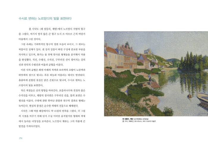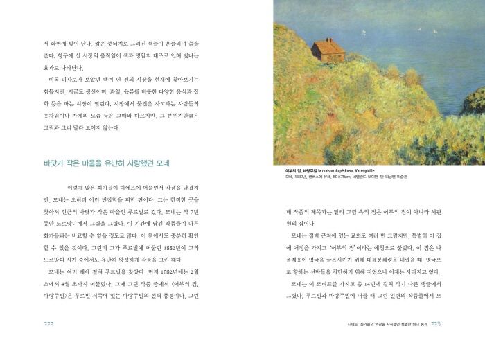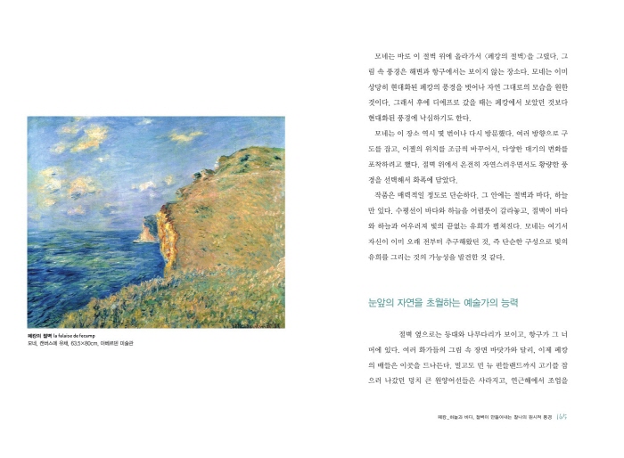 <ÆäIJ, ¹Ù´å°¡>´Â ¸ð³×°¡ 1881³â¿¡ ÆäIJ¿¡ ¸Ó¹°¸é¼ ±×¸° ÀÛǰÀÌ´Ù. ù ¹øÂ° ¾Æ³»ÀÎ Ä«¹ÌÀ¯°¡ Á×Àº ÈÄ¿´´Ù. ¸ð³×´Â ÀÌ ¿ÞÂÊ Àýº®¿¡ ¸ÅȤµÇ¾î ½Ã°£ÀÇ È帧¿¡ µû¶ó ´Ù¾çÇÏ°Ô º¯ÇÏ´Â Àýº®ÀÇ ¸ð½ÀÀ» ±×·È´Âµ¥ ¸ðµÎ 16Á¡À̳ª µÇ¾ú´Ù. ÀÌ·± ±×ÀÇ ²öÁú±èÀº ÀÏÂïÀÌ µå°¡¸¦ ºñ·ÔÇÑ µ¿·áµéµµ ĪÂùÇØ ¸¶Áö¾Ê´Â ¹Ì´öÀ̾úÀ¸¸ç, ÈÄ¿¡ À̾îÁö´Â <°ÇÃÊ´õ¹Ì>³ª <·ç¾Ó ´ë¼º´ç>, <¼ö·Ã> ¿¬ÀÛÀÇ ´ÜÃʸ¦ Á¦°øÇØÁÖ´Â °ÍÀ̶ó ÇÒ ¼ö ÀÖ´Ù. ±×¸² ¼Ó ÇÏ´ÃÀº ¸· ÇØ°¡ Áö·Á´Â ¸ð½ÀÀÌ´Ù. ¸ð³×´Â Àýº®¿¡ °¡±îÀÌ ´Ù°¡°¡¼ ¸Å½ºmass¸¦ Å©°Ô ±×·Á¼ °Á¶Çß´Ù. Àýº®Àº ³ë¶û, û»ö, ¿À·»Áö»öÀÌ ¼¯ÀÎ Çϴðú ¹Ù´ÙÀÇ ºûÀ» Á¦ ¸öÀ¸·Î ¹Þ¾Æµé¿© ¹°µéÀδÙ. ¸Ö¸® ±íÀº ¹Ù´ÙÀÇ ³ì»öÀÌ ¼öÆò¼±À» °Á¶ÇÑ´Ù. ÇϾé°Ô Ä¡´Â ÆÄµµ´Â ±¸¸§ÀÇ ¿òÁ÷ÀÓ°ú ´à¾Ò´Ù. °ÅÄ£ ³¯¾¾ÀÇ Çϴðú ¹Ù´Ù, Àýº®ÀÌ ¸¸µé¾î³»´Â Âû³ªÀÇ ¿ø½ÃÀû dz°æÀÌ´Ù. ±×¸² ¼Ó dz°æÀº ÇöÀç¿Í ¶È°°´Ù°í ÇÒ ¼ö ÀÖ´Ù. ±×°÷¿¡´Â ¾Æ¹«°Íµµ ´õÇØÁø °ÍÀÌ ¾ø´Ù. ¹Ù¶÷°ú ÆÄµµ°¡ ¹ÙÀ§¸¦ Á¶±Ý ´õ ±ð¾Æ³½ Â÷À̸¸ ÀÖÀ» »ÓÀÌ´Ù. ÃÖ´ëÇÑ ¾ß¼ºÀûÀÎ ¸ð½ÀÀ» ±×¸®±â À§ÇØ ¸ð³×´Â Àýº®À» µû¶ó ÇÑÂüÀ̳ª °É¾î°¬À» °ÍÀÌ´Ù. ȸ»ö ¹ÙÀ§ÀÇ ¹¶ÅöÇÑ ²¿¸®´Â ¿©ÀüÈ÷ ³¡À» ¸ð¸£°í »¸¾î³ª°¡°í ±× À§ÀÇ Çϴÿ¡´Â ¸ð³×°¡ º» °Í°ú Çϳªµµ ´Ù¸£Áö ¾ÊÀº žçÀÌ Áø´Ù. _p.151~154