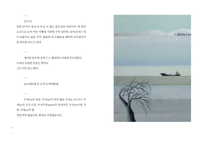 ½ÃÀÎ ÃÖµ·¼±À» ¸¸³ª´Â ¼ø°£ ´©±¸³ª ÀÏüÀÇ À§¾ö°ú Çã½ÄÀ» ÀÒ°í Çï·¼·¹ Ç®¾îÁø´Ù. ±×¸®ÇÏ¿© ±×ÀÇ ±ÛÀ» ÅëÇØ ±×¸¦ ¸¸³ª´Â ÀÏÀº »ç¹µ Áñ°Ì´Ù. ¼±¹®´äÀÇ, ¿ÃÂù »ý°¢°ú Á×À» ¸ÂÃá ±×ÀÇ »îÀÌ Åõ¸íÇÑ ¾ÆÆ÷¸®ÁòÀÌ µÇ¾î ¿ì¸®µé ¸¶À½ ±×´ÃÁø µ¥¸¦ ȯÈ÷ ¹àÇôÁֱ⠶§¹®ÀÌ´Ù. ³ÊÀÇ À̸§¸¸ µé¾îµµ °¡½¿¼Ó¿¡ Á¾ÀÌ ¿ï¸°´ÙÀÇ ±× Á¾¼Ò¸®, µè°í ½Í´Ù. (Àü»ó±¹_ÀÛ°¡)