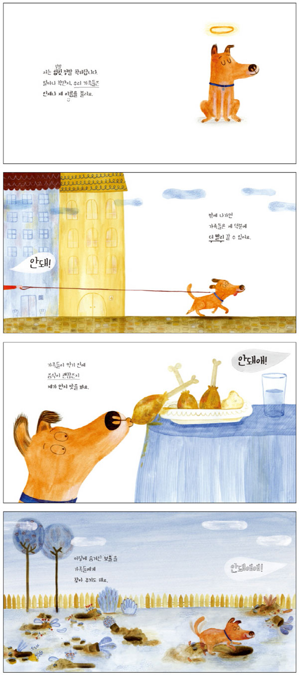 : ´©±º°¡ ¡°³» °ÍÀε¥ ³ªº¸´Ù ³²ÀÌ ´õ ¸¹ÀÌ ¾²´Â °ÍÀº ¹«¾ùÀϱî?¡± ¶ó´Â ¼ö¼ö²²³¢¸¦ ³½ ÀûÀÌ ÀÖ´Ù. °õ°õÀÌ »ý°¢ÇÏ´Ù°¡ °Ü¿ì ±Ã¸®ÇØ ³½ °ÍÀÌ ÃÊÀÎÁ¾À̾ú´Ù. ÇÏÁö¸¸ ´äÀº ¡®À̸§¡¯À̾ú´Ù. ´äÀ» µè´Â ¼ø°£ ¼Õ»ÁÀÌ ÃÄÁ³´Ù. ´©±º°¡°¡ ´Ù¸¥ »ç¶÷°ú ±¸º°ÇÏ¿© ³ª¸¦ ºÎ¸¦ ¶§ ¾²´Â °ÍÀÌ ³» À̸§À̴ϱî. ±×¸²Ã¥ ¡º¾ÈµÅ!¡»¿¡´Â ÀÚ±â À̸§ÀÌ ¡®¾ÈµÅ¡¯ÀÎ ÁÙ ¾Æ´Â °³°¡ ³ª¿Â´Ù. ÁÖÀÎÁý ½Ä±¸µéÀÌ ¾ðÁ¦³ª Àڱ⸸ º¸¸é ¡®¾ÈµÅ!¡¯¶ó°í ¼Ò¸®ÃƱ⠶§¹®ÀÌ´Ù. ÀÌ °³´Â ÀڱⰡ ³Ê¹« ¸»½é²Ù·¯±â¶ó¼ ÁÖÀÎÁý ½Ä±¸µéÀÌ ¡®¾ÈµÅ!¡¯¶ó°í ¼Ò¸®Ä£ °ÍÀ̶ó°í ²Þ¿¡µµ »ý°¢ÇÏÁö ¾Ê´Â´Ù. ´ÜÁö ÀڱⰡ ³Ê¹« »ç¶û½º·¯¿ö¼ Àڱ⸦ º¸±â¸¸ ÇÏ¸é ¡®¾ÈµÅ¡¯¶ó°í ºÎ¸£´Â °ÍÀ̶ó »ý°¢ÇÑ´Ù. ±×·¯´Ï ´ç¿¬È÷ ÀÚ±â À̸§ÀÌ ¡®¾ÈµÅ¡¯·Î »ý°¢ÇÒ ¼ö¹Û¿¡. ÀÌ °³´Â ½ÄŹ¿¡ Â÷·Á ³õÀº À½½Ä¿¡ °¡Á·µéº¸´Ù ¸ÕÀú Çô¸¦ ´ë¸é¼ ¡®À½½ÄÀÌ ±¦ÂúÀºÁö ¸ÕÀú ¸ÀÀ» º¸´Â °Í¡¯À̶ó »ý°¢Çß°í, ¿Â¸ö¿¡ ÈëÀ» ¹¯È÷¸ç ¶¥À§¸¦ ±¸¸£´Â °Íµµ ¡®°¡Á·µéÀ» À§ÇØ Ç×»ó ¸öÄ¡ÀåÀ» ÇÏ´Â °Í¡¯À̶ó »ý°¢Çß´Ù. Àý´ë ¸»½éÀ» ÇÇ¿ì´Â °Å¶ó°í »ý°¢ÇÏÁö ¾Ê¾Ò´Ù. ÇÏÁö¸¸ °¡Á·µéÀÇ ¿ÜħÀº ÀÌ °³°¡ ¸»½éÀ» ÇÇ¿ï ¶§¸¶´Ù ¡®¾ÈµÅ!¡¯¿¡¼ ¡®¾ÈµÅ¾Ö¡¯·Î ¶Ç ¡®¾ÈµÅ¾Ö¾Ö¡¯·Î Á¡Á¡ ´õ ±æ¾îÁö°í Ä¿Áø´Ù. ÀÌ °³´Â ±×°Íµµ °¡Á·µéÀÇ »ç¶ûÀÌ ´õ Ä¿Áö´Â °Å¶ó°í ¿©±â°í ¾ÆÁÖ Èå¹µÇÑ Ç¥Á¤À» Áþ´Â´Ù. ÀÌó·³ ÀÌ ±×¸²Ã¥Àº »ç¶÷ÀÇ ÀÔÀåÀÌ ¾Æ´Ï¶ó °³ÀÇ ÀÔÀå¿¡¼ À̾߱⸦ ²ø¾î°£´Ù. ÀÔÀåÀÌ ¹Ù²î´Ï±î ÇÑ »ç°Ç¿¡ ´ëÇÑ ÀÌÇØµµ ÀüÇô ´Ù¸£°Ô ¹Ù²ï´Ù. ¿©±â¿¡ ÀÌ ±×¸²Ã¥À» Àд Àç¹Ì°¡ ÀÖ´Ù. ªÀº ±Û, ¹Ýº¹µÇ¸é¼ Á¡Á¡ ±æ¾îÁö´Â ¡®¾ÈµÅ¡¯¶ó´Â ¸», ´Éû½º·¯¿ì¸é¼µµ »ç¶û½º·± °³ÀÇ Ç¥Á¤À» µû¶ó°¡´Ù º¸¸é ¿ôÀ½À» ÂüÀ» ¼ö ¾ø´Ù. ´õºÒ¾î °³ÀÇ ½ÃÁ¡¿¡¼ À̾߱⸦ µû¶ó °¡´Ùº¸¸é ¼·Î ÀÔÀåÀ» ¹Ù²ã »ý°¢ÇÏ´Â °ÍÀÌ »ó´ë¹æÀ» ÀÌÇØÇϴµ¥ ¾ó¸¶³ª Áß¿äÇÑ ÀÏÀÎÁö ÀÚ¿¬½º·¹ ±ú´Ý°Ô µÈ´Ù. ÀÌÁ¦ ¸· ¼¼»óÀ» ÀÌÇØÇϱ⠽ÃÀÛÇÑ À¯¾Æµé¿¡°Ô Àд Àç¹Ì¿Í ÇÔ²² °¿äÇÏÁö ¾Ê´Â °¨µ¿±îÁö ÁÖ´Â ±×¸²Ã¥À̶õ »ý°¢ÀÌ µé¾ú´Ù.