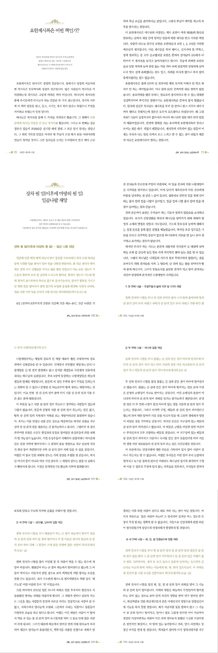 Áö±ÝÀº ¼º°æÀÌ ¸»ÇÏ´Â ¸¶Áö¸· ÁßÀÇ ¸¶Áö¸· ¶§. ÀηùÀÇ ½Ã°è´Â ¿¹¼ö´ÔÀÇ À縲À» ÇâÇØ ´Þ·Á°¡°í ¼º°æ¿¡¼ ¸»ÇÑ ¼¼»ó ³¡ÀÇ Â¡Á¶µéÀº ÀÌ¹Ì ÀϾ°í ÀÖ´Ù. ±×·±µ¥µµ Çö´ë ±³È¸´Â º¹ Áشٴ ±âº¹¼³±³¸¸ ÇÏ¸é¼ °è½Ã·ÏÀº ºÀÇØ ³õ°í ÀÐÁöµµ °¡¸£Ä¡Áöµµ ¾Ê°í ÀÖ´Ù. ¶§¹®¿¡ ¿äÇѰè½Ã·ÏÀÌ ¾î·Æ°í ¹«¼·±â¸¸ ÇÑ Ã¥À¸·Î ¾Ë·ÁÁ® ÀÖÁö¸¸ ¿äÇѰè½Ã·ÏÀº »ç½Ç Á¾¸»ÀÌ ¾Æ´Ï¶ó »õ·Î¿î ¼¼»óÀÇ ½ÃÀÛ¿¡ ´ëÇØ À̾߱âÇϰí ÀÖ´Ù. ¡ºÁö±ÝÀº °è½Ã·Ï ½Ã´ë¡»´Â ¿äÇѰè½Ã·ÏÀ» Æò½Åµµµµ ÀÌÇØÇÒ ¼ö ÀÖµµ·Ï ½±°íµµ ±íÀÌ ÀÖ°Ô ÆÄÇìÄ£ Ã¥ÀÌ´Ù. ¿äÇѰè½Ã·Ï¿¡ ´ã±ä ³î¶ó¿î ¿¹¾ðÀ» ÇϳªÇϳª ¤¾î°¡´Ù º¸¸é Çϳª´ÔÀÇ À½¼ºÀÌ µé¸®°í ¼º°æÀ» ÅëÇØ ¼¼»óÀ» ÅëÂûÇÒ ¼ö ÀÖ´Â ´«À» °®°Ô µÉ °ÍÀÌ´Ù.