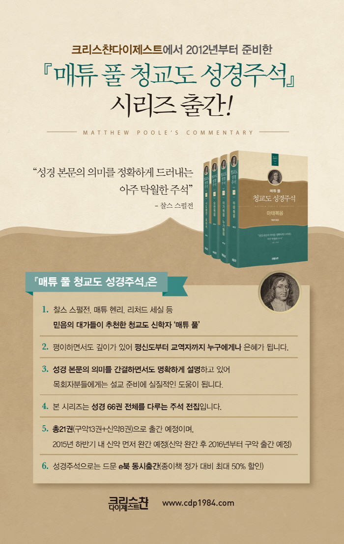 ¸ÅÆ© Ç®Àº 17¼¼±âÀÇ °¡Àå ¿µÇâ·Â Àִ û±³µµ ¸ñȸÀÚµé°ú »ç»ó°¡µé ÁßÀÇ ÇÑ »ç¶÷À̾ú´Ù. ±×´Â Á¾±³ ¹ÚÇØ ½Ã´ë µ¿¾È¿¡ Áö¼ÓÀûÀÎ ¾Ï»ì À§ÇùÀ¸·Î ÀÎÇØ¼ °í±¹À» ¶°³ª ³×´ú¶õµåÀÇ ¾Ï½ºÅ׸£´ã¿¡ Á¤ÂøÇÏ¿© ÀÚ½ÅÀÇ ÁÖÀúÀÎ ¡º¼º°æÁÖ¼®Áý¿ä¡»¿Í ¡º¸ÅÆ© Ç® ÁÖ¼®¡»À» ÁýÇÊÇÏ¿´´Ù. ¸ÅÆ© Ç®Àº À§´ëÇÑ ½ÅÇÐÀÚÀÌÀÚ Àú¼ú°¡ÀÓ°ú µ¿½Ã¿¡, °í°áÇÑ ÀÎǰ°ú ºÒ±¼ÀÇ ½Å¾ÓÀ» °£Á÷ÇÑ °æ°ÇÇÏ°í µ¶½ÇÇÑ ±×¸®½ºµµÀÎÀ¸·Î ¾Ë·ÁÁ® ÀÖ´Ù. ±×ÀÇ ÁÖ¼®Àº »ï¹é ³âÀÌ ³Ñ´Â ¼¼¿ù µ¿¾È ¼º°æ ÇØ¼®ÀÇ Ç¥ÁØÀÌ µÇ¾î ¿Ô°í, Áö±Ýµµ ¿©ÀüÈ÷ ¸ñȸÀÚ¿Í Æò½Åµµ¸¦ À§ÇÑ ½Å·ÚÇÒ ¸¸ÇÑ ÁÖ¼®ÀÌ µÇ°í ÀÖ´Ù. ±×ÀÇ ¼º°æ ÁÖÇØ´Â ¼º°æ ÀüüÀÇ °¢°¢ÀÇ Àý¿¡ ´ëÇÑ ÅëÂûÀ» Á¦°øÇØ ÁÖ°í, ¾Æ¿ï·¯ ¼º°æÀÇ °¢ Ã¥Àº ¹°·ÐÀÌ°í °¢ Àå¿¡ ´ëÇÑ Â©¸·ÇÑ ¼·Ð°ú ¿ä¾àµµ ÇÔ²² Á¦°øÇØ ÁØ´Ù. ¸ÅÆ© Ç®ÀÇ ÁÖ¼®Àº ¿©·¯ °¡Áö ´Ù¾çÇÑ ¹Ý·Ðµé¿¡ ´ëÇÑ ¹®´ä½Ä ÇØ¼³, ¹®ÈÀû ¹è°æ°ú ¿ª»çÀû ¿µÇâ¿¡ ´ëÇÑ ¼³¸í, ¼º°æ º»¹®¿¡ ´ëÇÑ °üÁÖ½Ä ÇØ¼® µîÀ» ±× Ư¡À¸·Î Çϰí ÀÖ´Ù. ±×´Â ¼º°æ º»¹®À» °Å±â¿¡ ÀüÁ¦µÇ¾î ÀÖ´Â ¹®ÈÀûÀÌ°í ¿ª»çÀûÀÎ ¹è°æ¿¡ ºñÃß¾î¼ Àаí ÇØ¼®ÇϰíÀÚ ÇÏ´Â ¸ñȸÀÚµé°ú Æò½Åµµµé¿¡°Ô ´ë´ÜÈ÷ À¯¿ëÇÑ ½ÇÁ¦ÀûÀÎ ³»¿ëÀ» Á¦°øÇÑ´Ù. ÀÌ ³î¶ø°í Ź¿ùÇÑ ÁÖ¼®Àº ¸ñȸÀÚµé°ú ½ÅÇлýµéÀº ¹°·ÐÀÌ°í ¼º°æÀ» ¸ÅÀÏ Àд Æò½Åµµ µ¶Àڵ鿡°Ôµµ Å« µµ¿òÀÌ µÉ °ÍÀÌ´Ù. Âû½º ½ºÆÞÀüÀ» ºñ·ÔÇØ¼ Áö±Ý±îÁö ¸¹Àº ½ÅÇÐÀÚµé°ú ¸ñȸÀÚµéÀÌ ¸ÅÆ© Ç®ÀÇ ÁÖ¼®À» ±×µé ÀÚ½ÅÀÇ ¼º°æ ¿¬±¸¸¦ À§ÇØ À¯¿ëÇÏ°Ô »ç¿ëÇØ ¿Ô´Ù.