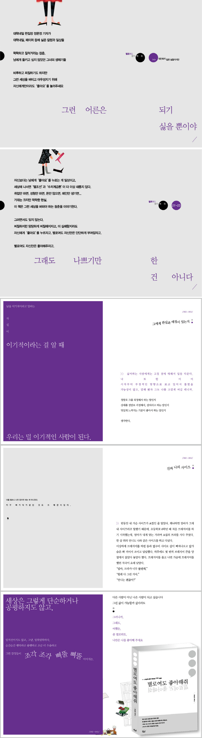 ¹°À» ¸Ô±âµµ Çϰí, ¼ûÀÌ Â÷±âµµ Çϰí, ¹ßÀÌ Àú·Á ¿À±âµµ ÇÒ °ÍÀÌ´Ù. ±×¶§ º¸ÀÌ´Â ¿· ·¹ÀÎÀÇ »ó±Þ¹ÝÀÌ ¸ÚÀÖ¾î º¸ÀÌ´Â °Ç ´ç¿¬ÇÏ´Ù. ÇÏÁö¸¸ ´©±¸³ª óÀ½¿¡´Â ±× ½Ã±â¸¦ °ÞÀ» ¼ö¹Û¿¡ ¾ø´Ù´Â °ÍÀ» ÀØÀ¸¸é ¾È µÈ´Ù. ¶Ç Àΰ£ÀÇ °¡Ä¡´Â ¼ºÃë¿Í ºñ·ÊÇϰųª ±×¿¡ Àý´ëÀûÀ¸·Î ¿¬°üµÇÁö ¾ÊÀ¸¸ç, ³ª´Â °³º°ÀûÀÎ ³ª·Î¼ Á¸Àç °¡Ä¡°¡ ÀÖ´Ù´Â °ÍÀ» ÀÌÇØÇØ¾ß ÇÑ´Ù. ÀÌ°É ¹Ï¾î¾ß ´ÙÀ½ ´Ü°è·Î ³ª¾Æ°¥ ¼ö ÀÖ´Ù. Ã¥ Á¦¸ñÀÎ ¡®º°·Î¿©µµ ÁÁ¾ÆÇØÁ࡯´Â ±×·¸°Ô Çã¿ìÀû´ë´Â ÀÚ½ÅÀ» ¹Ï¾î ´Þ¶ó´Â ºÎŹÀ̱⵵ ÇÏ´Ù. ¡ª ÇÁ·Ñ·Î±× Áß¿¡¼
