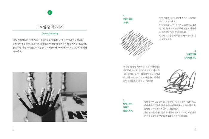 Ã¥ Á¦¸ñÀÌ ´äÀ» ¸»ÇØ ÁÖµíÀÌ Ã³À½ ±×·Á ºÁµµ, ±×¸²¿¡ ¼ÒÁúÀÌ ¾ø¾îµµ °í¹ÎÇÏÁö ¸»°í ½ÃÀÛÇϼ¼¿ä. ±×¸²Àº ´©±¸³ª ±×¸± ¼ö ÀÖ°í, ±×¸²À¸·Î ¾î¶² °Íµµ Ç¥ÇöÇÒ ¼ö ÀÖ½À´Ï´Ù. ¸ÅÀÏ Á¶±Ý¾¿ ±×¸®´Ù º¸¸é ±×¸²°ú Ä£ÇØÁö°í, ½Ç·ÂÀº ÀÚ¿¬½º·¹ µû¶ó¿À±â ¸¶·ÃÀÔ´Ï´Ù. ±×¸®°í Á» ¸ø ±×¸®¸é ¾î¶»°í, ¾È ±×·ÁÁö¸é ¾î¶»½À´Ï±î. ±×³¯ÀÇ ±âºÐ°ú ³¯¾¾¿¡ µû¶ó Àß ±×·ÁÁú ¼öµµ ÀÖ°í, ±×¸²ÀÌ ´Þ¶ó º¸ÀÏ ¼öµµ ÀÖÁö¿ä. ÇÑ °¡Áö È®½ÇÇÑ °ÍÀº ±àÁ¤ÀûÀ¸·Î »ý°¢ÇÏ´Â ½À°ü°ú Áñ°Å¿î ¸¶À½°¡Áü¸¸ ÀÖ´Ù¸é ±×¸²À» ±×¸± ¶§ ÃæºÐÇÑ ¿¡³ÊÁö¸¦ ¹ß»êÇÒ ¼ö ÀÖ´ä´Ï´Ù. ±× ¿¡³ÊÁö´Â ¾Æ¸¶µµ ¿ì¸®°¡ ´Ù¸¥ ¹«¾ð°¡¸¦ µµÀüÇÒ ¶§µµ µµ¿òÀ» ÁÙ °Å¿¹¿ä.