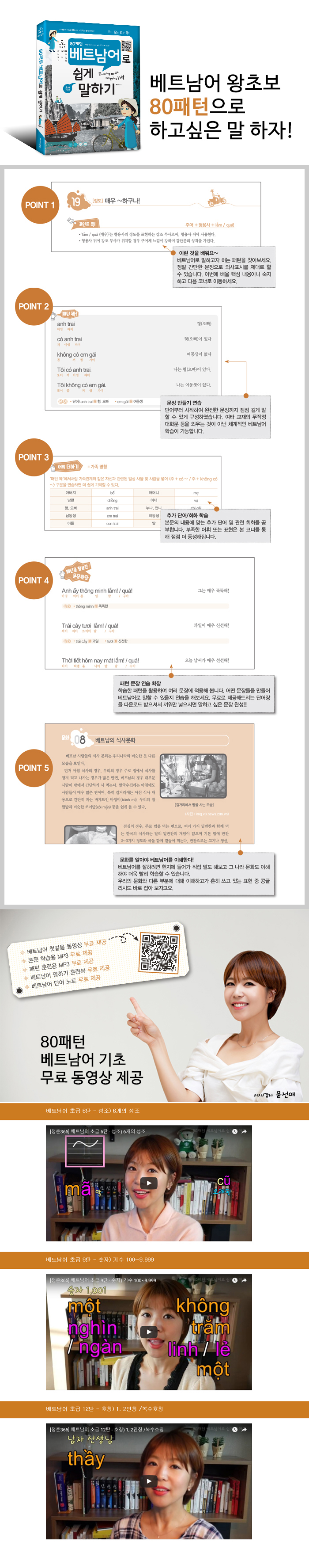 ÀúÀÚÀÌÀÚ °»çÀÎ À±¼±¾Ö ¼±»ýÀÓÀº °»ç·Î¼ ¸¹Àº ÇнÀÀÚ¿Í ÇÔ²² ¼ö¾÷Çϸç, ¾î¶»°Ô ÇÏ¸é ´õ ½±°í È¿À²ÀûÀ¸·Î º£Æ®³²¾î¸¦ °øºÎÇÒ ¼ö ÀÖÀ»±î?¶ó´Â °í¹Î¿¡ °í¹ÎÀ» ´õÇÏ´Ù°¡ ¡®80°¡Áö ÆÐÅÏÀ¸·Î ÇнÀÀÚµéÀÌ ÇÏ°í ½ÍÀº ¸»À» ¸ðµÎ ÇÒ ¼ö ÀÖµµ·Ï ÇØº¸ÀÚ!¡¯¶ó´Â ¸ñÇ¥¸¦ °¡Áö°í ÀÌ Ã¥À» ÁýÇÊÇÏ°Ô µÇ¾ú½À´Ï´Ù. ÇϳªÀÇ ´Ü¾îºÎÅÍ ½ÃÀÛÇØ ±¸·Î, ¹®ÀåÀ¸·Î Á¶±Ý¾¿ ³ÐÇô°¡¸ç ÀÚ¿¬½º·´°Ô ÀÔ¿¡¼ ³ª¿Ã ¼ö ÀÖµµ·Ï ±¸¼ºµÇ¾ú½À´Ï´Ù.