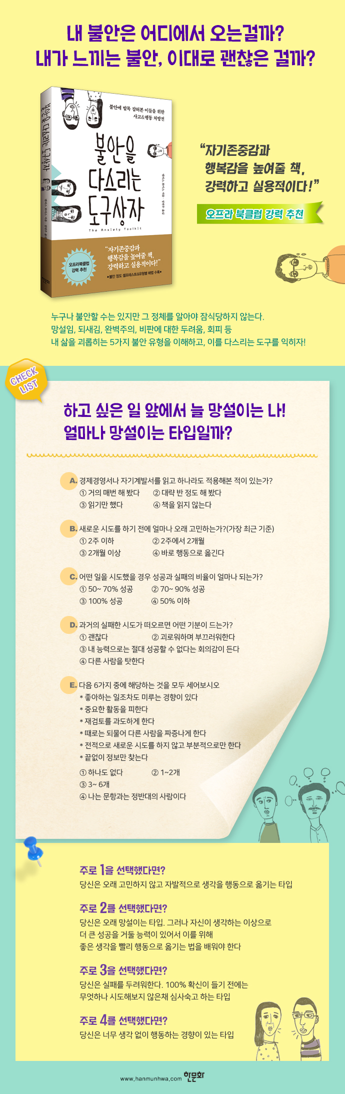 Àͼ÷ÇÑ ¿µ¿ª¿¡¼ ¹þ¾î³ª¸é »ç¶÷Àº ´©±¸³ª ºÒ¾ÈÀ» ´À³¤´Ù. ÇÏÁö¸¸ Àͼ÷ÇÑ ¿µ¿ª ¹ÛÀ¸·Î ¹ßÀ» ³»µóÁö ¾ÊÀ¸¸é Àλý¿¡¼ ¹«¾ð°¡¸¦ ³õÄ¡°Ô µÉ ¼öµµ ÀÖ´Ù. ºÒ¾ÈÇÑ ¼º°ÝÀ» Ÿ°í³ ³ª´Â Áß¿äÇÑ °áÁ¤À» ³»¸± ¶§¸¶´Ù ½ÅüÀû °íÅëÀ» µ¿¹ÝÇÑ ºÒ¾ÈÁõ»óÀ» °Þ¾ú´Ù. ÇÏÁö¸¸ ÀϽÃÀûÀ¸·Î ºÒ¾ÈÀÌ ³ô¾ÆÁ³´Ù°í ÇØ¼ ±× °áÁ¤À» °ÅµÎ¾ú´õ¶ó¸é ³» ÀλýÀº Áö±Ýº¸´Ù ÈξÀ ´õ °øÇãÇßÀ» °ÍÀÌ´Ù. ºÒ¾ÈÀ» ¿ÏÀüÈ÷ ¾ø¾Ö±â´Â °¡´ÉÇÏÁöµµ ¾Ê°Å´Ï¿Í À¯¿ëÇÏÁöµµ ¾Ê´Ù. ºÒ¾È ÀÚü´Â ¹®Á¦°¡ ¾Æ´Ï´Ù. ÁøÂ¥ ¹®Á¦´Â ºÒ¾ÈÀ¸·Î ¹«·ÂÇØÁø ³ª¸ÓÁö Á¤Ã¼ »óÅ¿¡ ºüÁ® Çì¾î ³ª¿ÀÁö ¸øÇÏ´Â °ÍÀÌ´Ù. ³ª´Â À̸¦ ¡®ºÒ¾ÈÀÇ µ£¡¯¿¡ °É¸° »óÅ·Πº»´Ù. Áö±ÝºÎÅÍ ºÒ¾ÈÀÇ µ£¿¡ ´ëóÇÏ´Â ¹ýÀ» ³íÇϰíÀÚ ÇÑ´Ù. ºÒ¾ÈÀÇ µ£Àº 5°¡Áö·Î, ¸Á¼³ÀÓ, µÇ»õ±è, ¿Ïº®ÁÖÀÇ, ºñÆÇ¿¡ ´ëÇÑ µÎ·Á¿ò, ȸÇÇ(¹Ì·ç±â Æ÷ÇÔ)ÀÌ´Ù. (1Àå ¡®ºÒ¾ÈÀº ¾î¶»°Ô ÀÛµ¿Çϴ°¡?¡¯ Áß¿¡¼)