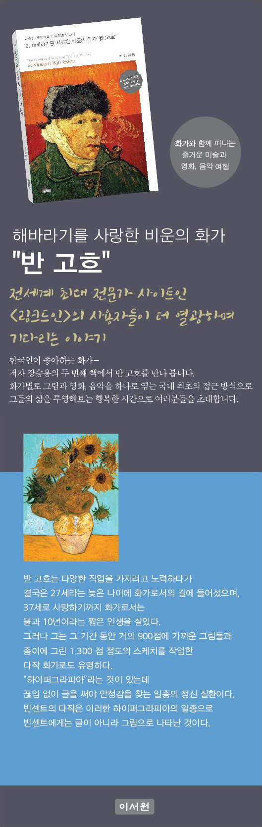 ºó¼¾Æ® ¹Ý °íÈå (Vincent Willem Van Gogh)´Â 1853³â 3¿ù 30ÀÏ¿¡ Ãâ»ýÇÏ¿© 1890³â 7¿ù 29ÀÏ¿¡ »ç¸ÁÇÑ ³×´ú¶õµå Ãâ½ÅÀÇ ¡®Èıâ ÀλóÁÖÀÇ È°¡¡¯ÀÌ´Ù. 10¿© ³âÀÇ ÂªÀº ±â°£ µ¿¾È ¾à 860Á¡ÀÇ À¯È¸¦ Æ÷ÇÔÇÏ¿© 2,100Á¡ ÀÌ»óÀÇ ÀÛǰÀ» ¸¸µé¾ú´Ù. ±×ÀÇ ÀÛǰÀº ÃÊ»óÈ, ÀÚÈ»ó, dz°æ, Á¤¹°, ¿Ã¸®ºê ³ª¹«, »çÀÌÇÁ·¯½º ³ª¹«, ¹Ð¹ç°ú ÇØ¹Ù¶ó±â µîÀÌ ÀÖÀ¸¸ç, »ó¡ÀûÀÎ »ö»ó°ú ±ØÀûÀ̰í Ãæµ¿ÀûÀ̸ç Ç¥ÇöÀûÀÎ ¹æ½ÄÀÌ Æ¯Â¡ÀÌ´Ù. ±×´Â »ý¾Ö µ¿¾È ´ÜÁö ÇÑ ÀÛǰ¸¸À» ÆÈ¾Ò°í °¡³°ú Á¤½ÅÁúȯÀ¸·Î °í»ýÇÏ´Ù°¡ 37¼¼¿¡ ÀÚ»ìÇÏ¿´´Ù. ±¤Àΰú ÀλýÀÇ ½ÇÆÐÀÚ·Î ÀνĵǾúÁö¸¸, ¿À´Ã³¯ ¸¹Àº »ç¶÷µé¿¡°Ô Á¦´ë·Î ÀÎÁ¤¹ÞÁö ¸øÇÑ ÃµÀç·Î Æò°¡ ¹Þ°Ô µÇ¾ú´Ù. ±×ÀÇ ±¤¹üÀ§ÇÑ »ó¾÷Àû, ´ëÁßÀû ¼º°øÀº 20¼¼±â Ãʱ⠵¶ÀÏÀÇ Ç¥ÇöÁÖÀÇÀÚµé°ú ¾ß¼öÆÄ°¡ ±×ÀÇ ÀÛǰÀ» »ç¿ëÇÏ¸é¼ ½ÃÀ۵Ǿú°í, ±×ÀÇ ¸í¼ºÀº 20¼¼±â µ¿¾È ²ÙÁØÈ÷ ¼ºÀåÇÏ¿´´Ù.