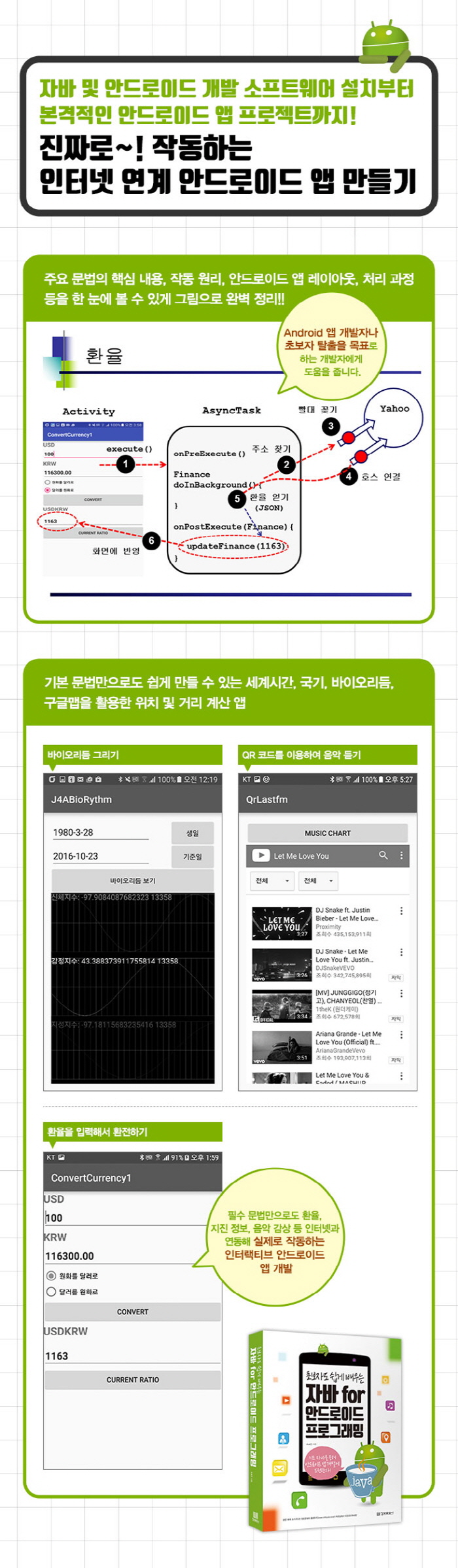 ÀÌ Ã¥Àº ¾Èµå·ÎÀÌµå ¾Û °³¹ß¿¡ ÇÊ¿äÇÑ ÀÚ¹Ù ¹®¹ý°ú ¾Èµå·ÎÀ̵åÀÇ ±¸Á¶Àû Ư¡À» ÀÌÇØÇÏ¿© ¾Èµå·ÎÀÌµå ¾ÛÀ» ½±°Ô °³¹ßÇÏ´Â ¹æ¹ýÀ» ¾Ë·ÁÁÝ´Ï´Ù. ¶ÇÇÑ ¸¹Àº ¿¹Á¦¸¦ ÅëÇØ ½¬¿ì¸é¼µµ ¿Ï¼ºµµ ÀÖ´Â ¾ÛÀ» °³¹ßÇϵµ·Ï µµ¿ÍÁÝ´Ï´Ù. ¹«¾ùº¸´Ùµµ Çʼö ¹× ÀÀ¿ë»çÇ×ÀÌ Ã¥ Àüü¿¡ °ÉÃÄ ¹Ýº¹Çؼ ¼³¸íµÇ¹Ç·Î ¡®ÁøÂ¥·Î ÀÛµ¿ÇÏ´Â ÀÎÅÍ³Ý ¿¬°è ¾Èµå·ÎÀÌµå ¾Û¡¯À» ¸¸µé ¼ö ÀÖÀ» °ÍÀÔ´Ï´Ù.