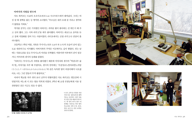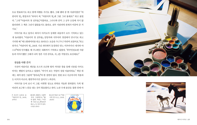 ¡ºÀ̽½ÀÌÀÇ Ã¹ ½ÉºÎ¸§¡»À» ±×¸± ¶§´Â ÀÚÅà ±Ùó¸¦ ²Ä²ÄÇÏ°Ô ÃëÀçÇß°í, ¡º¿À´ÃÀº ¹«½¼ ³¯?¡»Àº ±ÛÀ» ¾´ ¼¼Å¸ Å×ÀÌÁö¿Í ¾ð´ÏÀÇ ÀÚÅÿ¡¼ ¿©·¯ °¡Áö ¹°°ÇÀ» »çÁøÀ¸·Î ´ã¾Æ ±×·È´Ù. ¡º¸ñ¿åÀÌ ÁÁ¾Æ¡»¸¦ ¸¸µé ¶§´Â ¿ì¿¡³ë µ¿¹°¿ø¿¡¼ Çϸ¶°¡ ¹° À§·Î ¿Ã¶ó¿À´Â °ÍÀ» ±â´Ù¸®°í, ¡ºÀºÁö¿Í Ç«½ÅÀÌ¡» ¶§´Â ½ÇÁ¦·Î ¿Â÷¿¡ Ÿ º» °ÍÀº ¹°·Ð ÀÚ¼¼°¡ Àß ³ª¿Àµµ·Ï ö»ç¸¦ ³ÖÀº ¡®Ç«½ÅÀÌ¡¯ ºÀÁ¦ ÀÎÇüÀ» ¸¸µé±âµµ Çß´Ù. ±×·¯°í º¸´Ï ÇǾƳë À§¿¡ ³õ¿© ÀÖ´Â ¼ÕÀ¸·Î ¸¸µç ¡®Ç«½ÅÀÌ¡¯´Â ²¿¸®°¡ Âî±×·¯Á® ÀÖ´Ù. - º»¹® 196~197ÂÊ