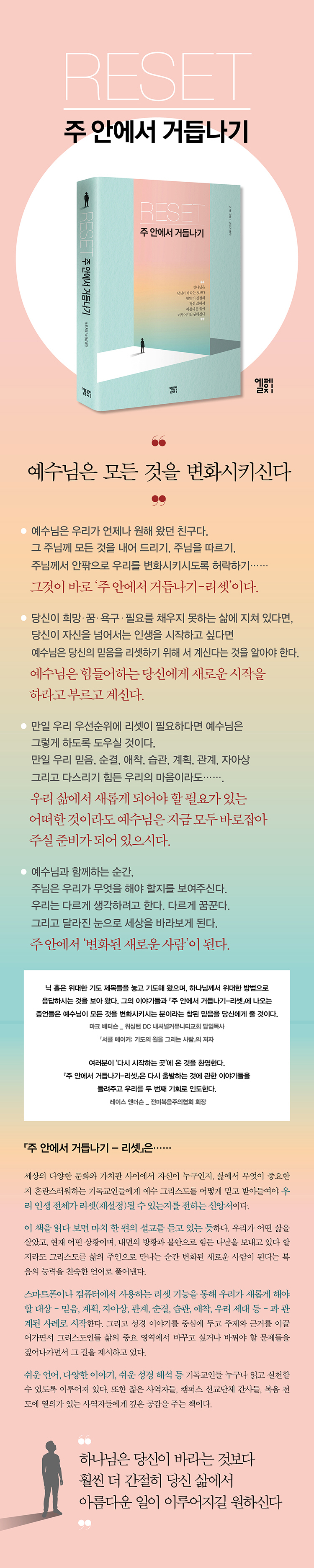 ´ç½ÅÀ» À§ÇÑ ¿ì¸®ÀÇ ±âµµ´Â ÀÌ Ã¥À¸·Î ´ç½ÅÀÌ ¡®º¯ÈµÈ »õ·Î¿î »ç¶÷¡¯ÀÌ µÇ´Â °ÍÀÌ´Ù. ´ç½Å »î¿¡¼ ¸®¼ÂÀÌ ÇÊ¿äÇÑ ºÎºÐÀÌ ¹«¾ùÀ̵çÁö °£¿¡ ¿¹¼ö ±×¸®½ºµµÀÇ ±¸¿øÀÇ ¸Þ½ÃÁö¸¦ ÅëÇØ ¹Ù·Î ¿À´Ã Áö±Ý ¿©±â¼ º¯ÈµÉ ¼ö ÀÖ´Ù. - Á¶½Ã ¸ÆµµÀ£, ·çÀ̽º ÆÈ¶ó¿ì, ¶óºñ ÀçÄ¿¶óÀ̾