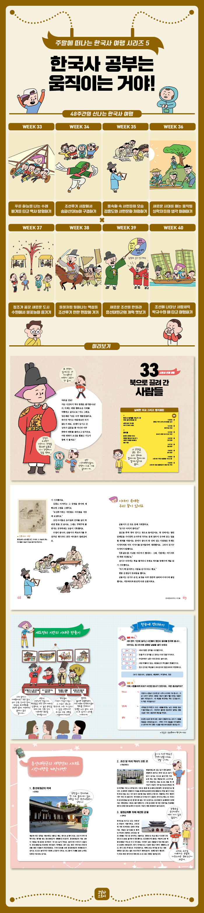 ¿ª»ç´Â °áÄÚ Áö·çÇϰųª µüµüÇÑ °ú¸ñÀÌ ¾Æ´Ï´Ù. Àü±¹ °÷°÷¿¡ ¼û¾î ÀÖ´Â ¿ª»çÀÇ ÇöÀåµéÀ» ã¾Æ°¡ º¸¸é, À§ÀεéÀÌ °Å´Ò¾ú´ø ¹ßÀÚÃ븦 µû¶ó ¹â¾Æº¼ ¼öµµ ÀÖ°í, Èï¹ÌÁøÁøÇÑ Àü¼³À̳ª ¸ðÇè À̾߱⸦ µéÀ¸¸ç ±× ÁÖÀΰøÀÌ µÇ´Â »ó»óÀÇ ³ª·¡¸¦ ÆîÃĺ¼ ¼öµµ ÀÖ´Ù. ¡ì¾Æºü, Çѱ¹»ç ¿©Çà ¶°³ª¿ä!¡í 1±Ç¿¡¼ »çÃѻ簡 ÃÖÃÊÀÇ Àηù¸¦ ¸¸³ª°í »ï±¹ÀÌ Åº»ýÇÏ´Â °úÁ¤À» ÁöÄѺ¸¾Ò´Ù¸é, 2±Ç¿¡¼´Â »ï±¹ÀÇ Ä¡¿ÇÑ ÀüÀï ÇöÀå°ú ½Å¶óÀÇ ºÒ±³¹®È, ¹ßÇØÀÇ ¹®È±îÁö ¸¸³¯ ¼ö ÀÖ´Â ½Ã°£ ¿©ÇàÀ» ¶°³µ´Ù. 3±Ç¿¡¼´Â ÈĻﱹ °Ç±¹ÀÇ ÁÖ¿ªÀ» ¸¸³ª°í ÀÌÈÄ ÇѹݵµÀÇ »õ·Î¿î ÁÖÀÎÀÌ µÈ °í·Á·Î ½Ã°£¿©ÇàÀ» ¶°³µ°í, 4±Ç¿¡¼´Â »õ·Î¿î ³ª¶ó·Î ¼¼¿öÁø Á¶¼±ÀÇ À̾߱⸦ ¾ÆÀ̵éÀÌ ¡®½ÇÁ¦·Î¡¯ ¸¸³ª·¯ °¬´Ù. À̹ø 5±Ç¿¡¼´Â ÀÓÁø¿Ö¶õÀ¸·Î ¾ÆÆÄÇß´ø ¹é¼ºµéÀÇ »î°ú ±× ¼Ó¿¡¼µµ Èñ¸ÁÀ» ÀÒÁö ¾Ê°í ¼¹Î¹®È¸¦ ²ÉÇÇ¿î Á¶¼±ÀÇ Èıâ·Î ¶°³ª º¸ÀÚ. ¹é¼ºµéÀÇ »ýȰÀ» À§ÇØ ½° ¾øÀÌ °í¹ÎÇÏ°í ¿¬±¸ÇÑ ½ÇÇÐÀÚµéÀ» ¸¸³ªº¸°í, ÀåÅÍ¿¡¼ ÀÏÇÏ´Â Àå»ç²Û°ú Á¶¼±½Ã´ë ÃÖ°í ÀÓ±ÝÀ¸·Î ²ÅÈ÷´Â Á¤Á¶ÀÇ À̾߱⸦ µéÀ» ¼ö ÀÖÀ» °ÍÀÌ´Ù. ¡ì¾Æºü, Çѱ¹»ç ¿©Çà ¶°³ª¿ä!¡í´Â ÀÌÅä·Ï »ý»ýÇÏ°Ô »ì¾Æ ¼û ½¬´Â ¿ª»ç¸¦ ¾ÆÀ̵鿡°Ô üÇè½ÃÄÑ ÁÙ ¼ö Àִ åÀÌ´Ù. À̹ø ÁÖ¸»¿¡´Â ¾ÆÀ̵鿡°Ô °ÔÀӱ⳪ ¸¸ÈÃ¥ ´ë½Å ¿ª»çÃ¥À» ¼Õ¿¡ µé·ÁÁÖ°í, Àç¹Ì¿Í ÀÇ¹Ì ¸ðµÎ ÀÖ´Â Çѱ¹»ç ¿©ÇàÀ» ¶°³ª´Â °Ô ¾î¶³±î?