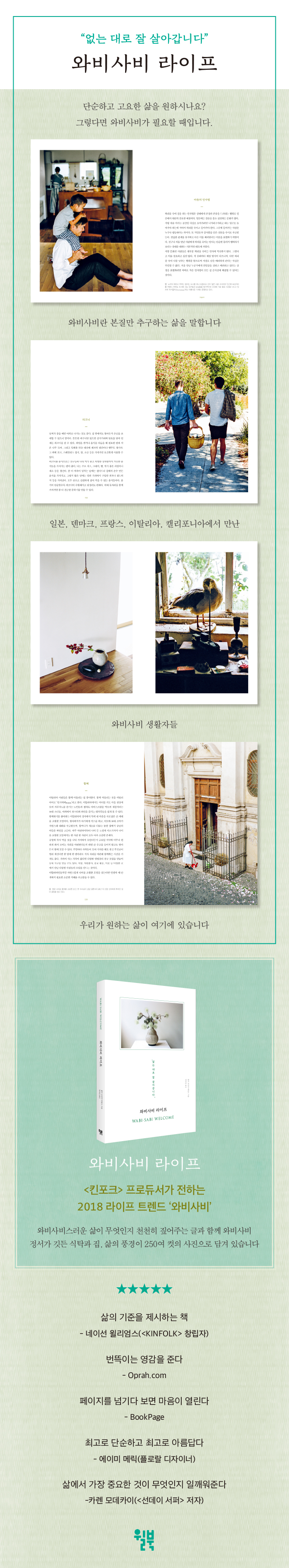 Ã¥¿¡´Â ¿Íºñ»çºñÀûÀÎ »îÀÇ Åµµ¸¦ ¹Ý¿µÇÑ ¸ðµç °ÍµéÀÌ ½Ç·Á ÀÖ´Ù. ÀÎÅ׸®¾îºÎÅÍ ¹°°ÇÀ» °í¸£´Â ¹ý, ÁýÀ» ²Ù¹Ì´Â ¹ý, ¼Õ´ÔÀ» ÃÊ´ëÇÏ´Â ¹ý, ÈÞÀÏÀ» º¸³»´Â ¹ý±îÁö. ½±°íµµ ¸íÄèÇÏ´Ù. <¿Íºñ»çºñ ¶óÀÌÇÁ>´Â ¿ì¸®°¡ ¿øÇÏ´Â »îÀÇ ¸ðµ¨À» °£°áÇÑ ±Û°ú ´ã¹éÇÑ »çÁøÀ¸·Î Á¦½ÃÇÏ´Â ¾Æ¸§´Ù¿î Ã¥ÀÌ´Ù.