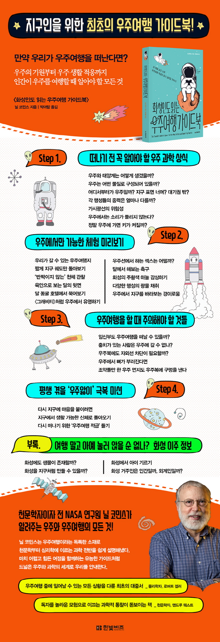 ¸¸ÀÏ ´ç½Å¿¡°Ô ¿ìÁÖ¿©ÇàÀÇ ±âȸ°¡ ÁÖ¾îÁø´Ù¸é ¾î¶³±î? ÀÌ Ã¥Àº ¡®ÃæÄ¡°¡ ÀÖÀ¸¸é ¿ìÁÖ¿¡ ³ª°¥ ¼ö ¾ø³ª?¡¯, ¡®¿ìÁÖ¿¡¼ ¸Ö¹Ì°¡ ³ª¸é ¾î¶±ÇÏÁö?¡¯, ¡®µ·Àº ¾ó¸¶³ª µé±î?¡¯ µî ¿ìÁÖ·Î ¶°³¯ »ç¶÷À̶ó¸é °¡Áú¹ýÇÑ ¸ðµç Áú¹®°ú ±× ÇØ´äÀÌ ´ã°Ü ÀÖ´Ù. õ¹®ÇÐÀÚÀÌÀÚ Àü NASA ¿¬±¸¿øÀÎ ÀúÀÚ ´Ò Äڹνº´Â ¿ìÁÖ¿©ÇàÀÚ°¡ ¸Â´Ú¶ß¸®°Ô µÉ »ç¼ÒÇÏ°í ±â¹ßÇÑ »óȲ¿¡¼ºÎÅÍ ¿ìÁÖÀÇ ±â¿ø¿¡ À̸£±â±îÁö ´Ù¾çÇÑ ¿ìÁÖ °úÇÐ »ó½ÄÀ» ½¬¿î ¾ð¾î·Î ¼³¸íÇÑ´Ù. õ¹®Çп¡¼ºÎÅÍ ¹°¸®ÇÐ, »ý¹°ÇÐ, ½É¸®ÇÐ, »çȸÇп¡ À̸£±â±îÁö ºÐ¾ß¸¦ ³Ñ³ªµå´Â ¹æ´ëÇÑ Áö½ÄÀ» À§Æ® ÀÖ°Ô Ç®¾î³½ ÀÌ Ã¥Àº ¿ì¸®°¡ ¹ß µó°í ¼ ÀÖ´Â Ç༺°ú ÀÌ Ç༺ÀÌ ¼ÓÇÑ ¿ìÁÖ¸¦ ¹Ù¶óº¸´Â »ö´Ù¸¥ °üÁ¡À» Á¦½ÃÇÒ °ÍÀÌ´Ù.