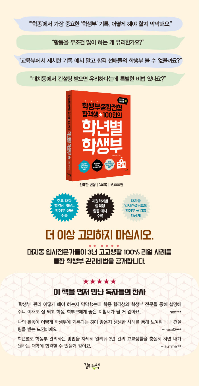ÇлýºÎÁ¾ÇÕÀüÇü¿¡¼ °¡Àå Áß¿äÇÑ °ÍÀÌ ÇлýºÎ °ü¸®ÀÔ´Ï´Ù. ÀÚ±â¼Ò°³¼, ¸éÁ¢¿¡ ´ã±â´Â ³»¿ëµéÀº ¿À·ÔÀÌ ÇлýºÎ¿¡ ¾î¶² ³»¿ëÀÌ ±â·ÏµÇ¾ú´À³Ä¿¡ µû¶ó ÈûÀ» ¾ò±âµµ Çϰí Àұ⵵ Çϱ⠶§¹®ÀÔ´Ï´Ù. µû¶ó¼ ´ëÀÔ Áغñ °úÁ¤¿¡¼ ¸Å Çб⸶´Ù ÇлýºÎ ±â·ÏÀ» ²Ä²ÄÇÏ°Ô È®ÀÎÇØº¸´Â °ÍÀº ³»½Å°ü¸®¸¸Å ¸Å¿ì Áß¿äÇÑ Áغñ °úÁ¤ Áß Çϳª¶ó°í »ý°¢ÇÕ´Ï´Ù. ÇÏÁö¸¸ Àúµµ ¾î¶² ±â·ÏÀÌ ³» ¸ð½ÀÀ» Àß ´ã¾Æ³»°í ÀÖ´Â ±â·ÏÀÎÁö¿¡ ´ëÇÑ È®½ÅÀÌ ¾ø¾î ¸·¸·Çϱ⸸ Çß½À´Ï´Ù. ÀÌ Ã¥¿¡´Â ³ªÀÇ ¾î¶² ¸ð½ÀÀÌ ÇлýºÎ¿¡ ¾î¶² ÇüÅÂÀÇ ±â·ÏÀ¸·Î ´ã°Ü¾ß ÇÏ´ÂÁö »ý»ýÇÑ »ç·Ê¸¦ ÅëÇØ ÃæºÐÈ÷ Àß ´ã°Ü ÀÖ¾î ÇлýºÎ °ü¸®¿¡ ¾î·Á¿òÀ» °Þ´Â ¸ðµç À̵鿡°Ô ÁÁÀº °¡À̵尡 µÉ °ÍÀÔ´Ï´Ù. ÀÌ Ã¥ÀÇ °úÁ¤À» µû¶ó Â÷±ÙÂ÷±Ù ÀÚ½ÅÀÇ È°µ¿µéÀ» ½×¾Æ³ª°£´Ù¸é ¾î´À»õ ¿Ï¼ºµÈ ³ª¸¸ÀÇ ÇлýºÎ¸¦ ¿Ï¼º½Ãų »Ó¸¸ ¾Æ´Ï¶ó ÀÚ½ÅÀÌ ¿øÇÏ´Â ´ëÇÐÀÇ Çհݹ®¿¡ µé¾î°¥ ¼ö ÀÖÀ¸¸®¶ó »ý°¢ÇÕ´Ï´Ù.