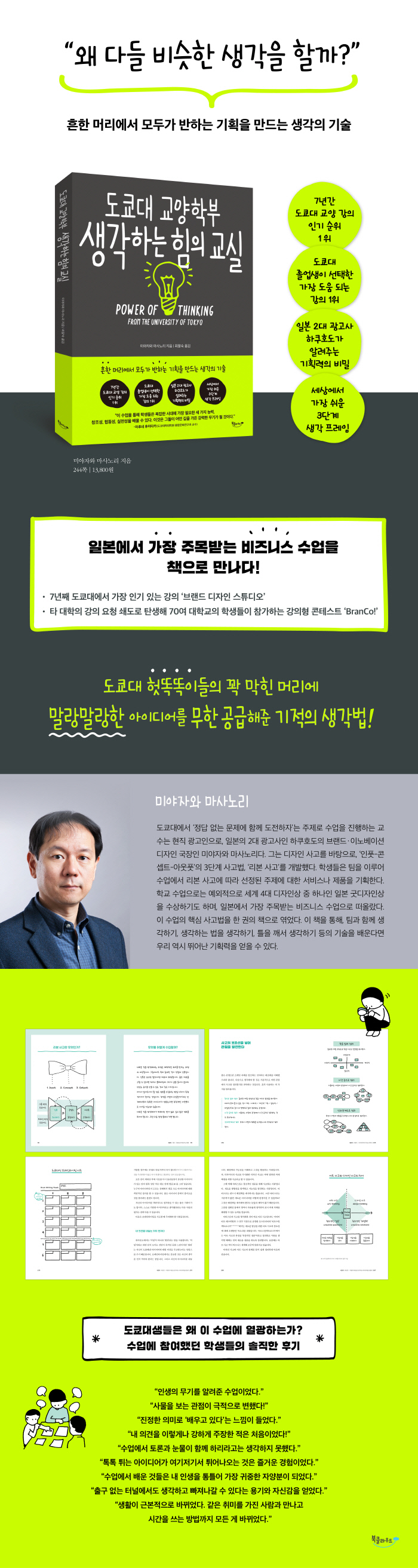 ¼ö¾÷À» µéÀº µµÄì´ë»ýµéÀº ³î¶ó¿î º¯È¸¦ º¸¿©ÁÖ¾ú´Ù. »ý°¢ÇÏ´Â ±â¼úÀ» óÀ½ ¹è¿ü´Ù°í °¨ÅºÇϰí, ÀÚ½ÅÀÇ ÀǰßÀ» Á¦´ë·Î À̾߱âÇÏÁö ¸øÇÏ´ø ÇлýÀÌ ³î¶ö ¸¸ÇÑ ¾ÆÀ̵ð¾î¸¦ ³»³õ±âµµ Çß´Ù. ÀÌ·¸°Ô µµÄì´ë»ý¿¡°Ô¼ ±ØÀûÀÎ º¯È¸¦ À̲ø¾î³ÂÀ¸¸ç, ÀϺ»¿¡¼ °¡Àå ÁÖ¸ñ¹Þ´Â ºñÁî´Ï½º ¼ö¾÷ÀÇ ÇÙ½É »ç°í¹ýÀ» ÇÑ ±ÇÀÇ Ã¥À¸·Î ¿«¾ú´Ù. ÀÌ Ã¥À» ÅëÇØ, ÆÀ°ú ÇÔ²² »ý°¢Çϱâ, »ý°¢ÇÏ´Â ¹ýÀ» »ý°¢Çϱâ, ƲÀ» ±ú¼ »ý°¢Çϱ⠵îÀÇ ±â¼úÀ» ¹è¿î´Ù¸é ¿ì¸® ¿ª½Ã ¶Ù¾î³ ±âȹ·ÂÀ» ¾òÀ» ¼ö ÀÖÀ» °ÍÀÌ´Ù.