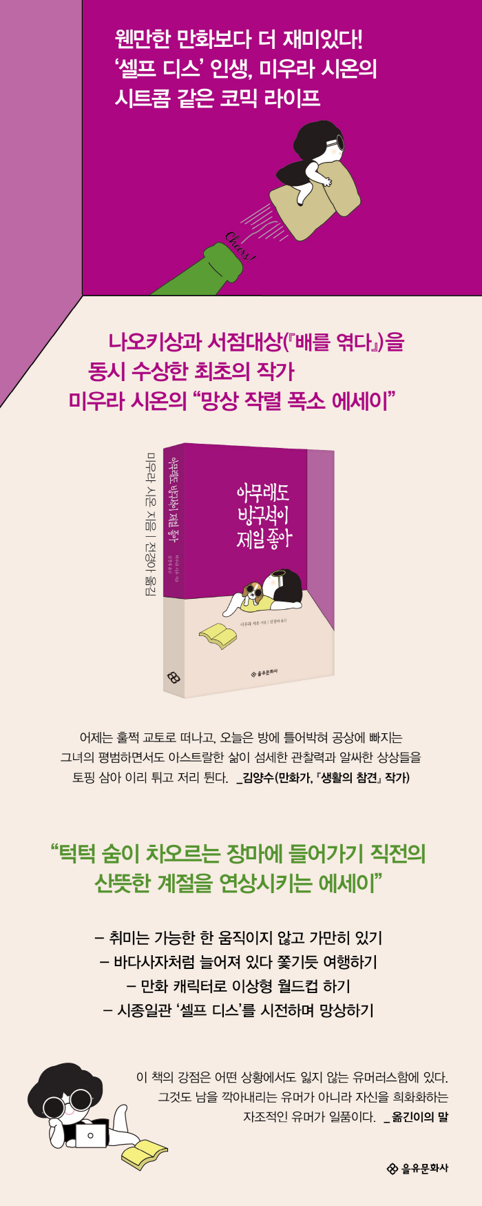 ¡º¸¶È£·Î ¿ª ´Ù´Ù ½ÉºÎ¸§Áý¡», ¡º¹è¸¦ ¿«´Ù¡» µîÀ¸·Î ±¹³» ÀϺ»¹®ÇÐ µ¶ÀÚ »çÀÌ¿¡¼µµ µÎÅÍ¿î °íÁ¤ÆÒÀ» °Å´À¸®°í ÀÖ´Â ¹Ì¿ì¶ó ½Ã¿ÂÀÇ ¿¡¼¼À̰¡ À»À¯¹®È»ç¿¡¼ Ãâ°£µÇ¾ú´Ù. ±âº¹ÀÌ ¾ø´Â Æò¹üÇÑ Àϻ󿡼¾ß¸»·Î Àç¹ÌÀÖ´Â ÀÏÀ̳ª ±â¹¦ÇÑ ÀÏ, ºÐ³ë°¡ ÀÛ·ÄÇÏ´Â ÀÏÀÌ ÀÖ´Ù´Â ½Å³äÀ» °¡Áø ÀÛ°¡°¡ ÀÚ½ÅÀÇ ÀÏ»óÀÇ ¸ð½ÀÀ» °Åħ¾ø´Â »ó»ó·Â°ú 4Â÷¿ø ¸Å·ÂÀ» »Ë³»¸ç À¯ÄèÇÏ°Ô ±×·Á ³½´Ù. ÀÌ Ã¥¿¡¼ ¹Ì¿ì¶ó ½Ã¿ÂÀº ÀÚ½ÅÀ» ÀÖ´Â ±×´ë·Î º¸¿© ÁÖ¸é¼ ÀÜÀÜÇÑ ÀÏ»óÀ» ÀÚÁ¶ÀûÀÎ À¯¸Ó·Î ½ÂȽÃ۸ç ÇÑÆíÀ¸·Î´Â °Å±â¼ ÆÄ»ýÇÏ´Â ¿ì¿¬ÇÑ Àǹ®Á¡µé°ú °íÂûµéÀ» À̾߱âÇÑ´Ù. ¡°¾Æ¹«°Íµµ ÇÒ ¸»ÀÌ ¾ø´Ù. ±×Àú Àç¹ÌÀÖÀ» »ÓÀÌ´Ù¡±¶ó´Â ÀϺ»ÀÇ ÇÑ µ¶ÀÚÀÇ ¸»Ã³·³ ½¯ »õ ¾øÀÌ ÅÍÁö´Â ¹Ì¿ì¶ó ½Ã¿ÂÀÇ ¸Á»ó°ú »ó»ó·Â, µ¶Æ¯ÇÑ ¼¼°è°üÀº µ¶ÀÚµéÀÇ ÀÏ»ó¿¡ ÆÄ¿ö ³ÑÄ¡´Â ¿ôÀ½À» ¼±¹°ÇØ ÁÙ °ÍÀÌ´Ù.