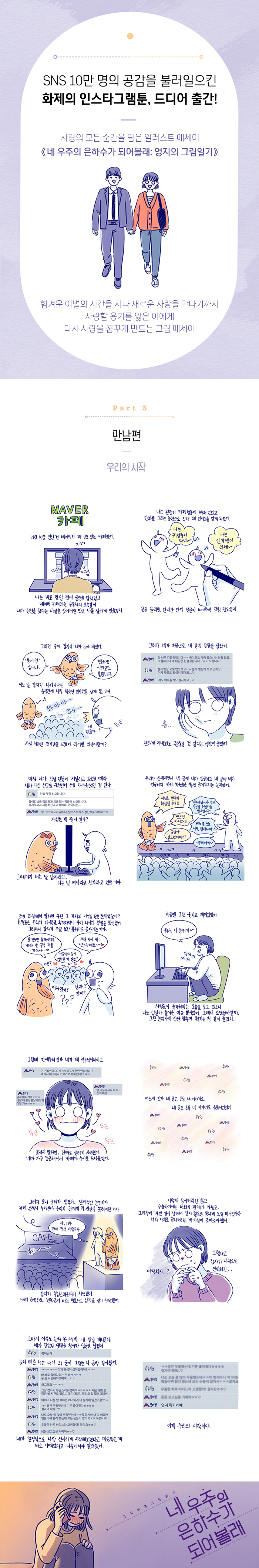 ¸¸È°¡, ÀÏ·¯½ºÆ®·¹ÀÌÅÍ. ·¹ÁøÄڹͽº¿¡¼ ¡´°í·¡¡µ¸¦ ¿¬ÀçÇßÀ¸¸ç ÀνºÅ¸±×·¥¿¡ ¡´¿µÁöÀÇ ±×¸²Àϱ⡵¸¦ ¿¬Àç ÁßÀÌ´Ù. ´©±¸³ª °ø°¨ÇÒ ¼ö ÀÖ´Â ÀÏ»óÀÇ ±ú´ÞÀ½°ú ´Þ´ÞÇÑ ¿¬¾ÖÀÇ ¼ø°£µéÀ» ³× ÄÆ ¸¸È·Î ±×·Á Å« ¹ÝÇâÀ» ¾ò¾ú´Ù. ¾ÕÀ¸·Îµµ ¸¹Àº »ç¶÷µéÀÇ ¸¶À½À» µÎµå¸± ¼ö ÀÖ´Â ±×¸²À» ±×¸®°íÀÚ ÇÑ´Ù.