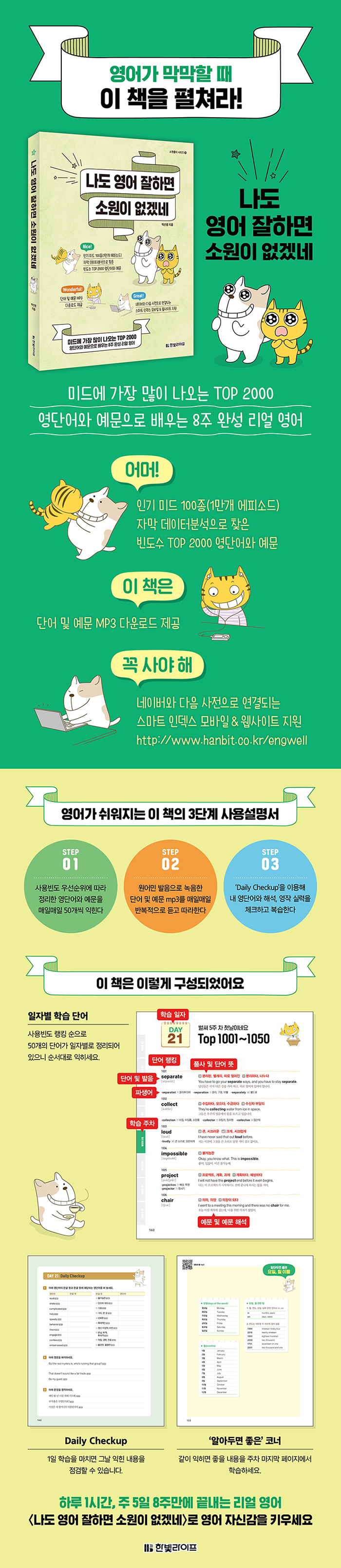 Á¦°¡ ¿µ¾î¸¦ ÆíÇÏ°Ô Çϰųª ³²À» °¡¸£Ä¥ ¼öÁØÀº ¾Æ´Ï¶ó ¿µ¾îÃ¥À» ¾µ °Å¶ó´Â »ý°¢À» ÇØ º» ÀûÀÌ ¾ø¾ú½À´Ï´Ù. ´Ù¾çÇÑ À帣ÀÇ ¹Ìµå ÀÚ¸· µ¥ÀÌÅ͸¦ ºÐ¼®ÇÑ µÚ ¿ø¾î¹ÎÀÌ °¡Àå ¸¹ÀÌ »ç¿ëÇÏ´Â ºóµµ¼øÀ¸·Î ¿µ´Ü¾î¿Í ¿¹¹®À» Á¤¸®Çؼ ¿µ¾î¸¦ ¹è¿î´Ù¸é ¾î¶³±î ÇÏ´Â »ý°¢Àº óÀ½¿¡´Â Á¦°¡ ¹Ìµå¸¦ ÀÚ¸· ¾øÀÌ ÆíÇÏ°Ô º¸°í ½Í¾î ¶°¿Ã¸° °ÍÀ̾úÁö¿ä. ±×°Ô ½Ç¸¶¸®°¡ µÇ¾î Àα⠹̵å 100Á¾ÀÇ 1¸¸¿© °³ ¿¡ÇǼҵå ÀÚ¸· µ¥ÀÌÅ͸¦ ºÐ¼®ÇÏ°í ´Ü¾îÀÇ ½ÇÁ¦ ¾²ÀÓ»õµéÀ» »ìÆìº¸¾Ò½À´Ï´Ù. ±×¸®°í ¹Ìµå¿¡¼ °¡Àå ¸¹ÀÌ »ç¿ëÇÏ´Â ºóµµ¼ø¿¡ µû¶ó Á¤¸®ÇÑ ¿µ´Ü¾î¿Í »ý»ýÇÑ ´Ü¾î »ç¿ë ¿¹¹®À» ÁÖº¯ »ç¶÷µé¿¡°Ô º¸¿©ÁÖ¾ú½À´Ï´Ù. »ý°¢º¸´Ù ÁÁÀº ÁÖÀ§ ¹ÝÀÀ¿¡ ÀÌ Ã¥ÀÌ ÁøÂ¥ »ýȰ ¿µ¾î¸¦ ¹è¿ì°í ½ÍÀº »ç¶÷µé¿¡°Ô ²Ï ±¦ÂúÀº ±æ¶óÀâÀ̰¡ µÉ ¼ö ÀÖ°Ú´Ù ½Í¾ú½À´Ï´Ù.