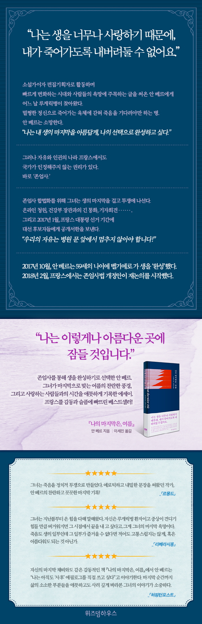 ÇÁ¶û½º º¸¸£µµ¿¡¼ ž´Ù. ¼Ò¼³°¡ÀÌÀÚ ÆíÁý±âȹÀڷΠȰµ¿ÇÏ¸ç ºü¸£°Ô º¯ÈÇÏ´Â ½Ã´ë¿Í »ç¶÷µéÀÇ ¿å¸Á¿¡ ÁÖ¸ñÇÏ´Â ±ÛÀ» ½è´Ù. 2015³â, ±ÙÀ§Ãà¼ºÃø»è°æÈÁõ(·ç°Ô¸¯º´) Áø´ÜÀ» ¹Þ°í »î°ú Á×À½¿¡ °üÇÑ Àΰ£ÀÇ ±Ç¸®¿¡ ´ëÇØ Ä¡¿ÇÏ°Ô °í¹ÎÇß´Ù. ÀÌÈÄ ÇÁ¶û½ºÀÇ Á¸¾ö»ç ÇÕ¹ýȸ¦ À§ÇØ ¿Â¶óÀΠû¿ø, °Ç°ºÎ Àå°ü°úÀÇ ±ä ÅëÈ, ±âÀÚȸ°ß µîÀÇ Àû±ØÀûÀΠȰµ¿À» º¸¿´´Ù. 2017³â 1¿ù, ÇÁ¶û½º ´ëÅë·É ¼±°Å ±â°£¿¡´Â ´ë¼± Èĺ¸Àڵ鿡°Ô ¡®»ýÀÇ ¸¶Áö¸·À» ½º½º·Î ¼±ÅÃÇÒ ±Ç¸®¡¯¸¦ ÁÖÀåÇÏ´Â °ø°³¼ÇÑÀ» º¸³» ÈÁ¦°¡ µÇ¾ú´Ù. 2017³â 10¿ù 2ÀÏ, 59¼¼ÀÇ ³ªÀÌ¿¡ º§±â¿¡·Î °¡ ½º½º·Î »ýÀ» ¿Ï¼ºÇß°í, 10¿ù 4ÀÏ ÀÌ Ã¥ÀÌ Ãâ°£µÇ¾ú´Ù. ÇÁ¶û½ºÀÇ Á¸¾ö»ç¹ý °³Á¤¾ÈÀº 2018³â 2¿ù ±¹È¸¿¡ Á¦ÃâµÇ¾î ³íÀÇ ÁßÀÌ´Ù.