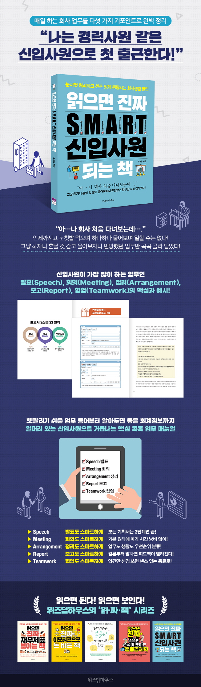ȸ»ç¿¡ ÀÔ»çÇØ¼ ÀûÀÀÇϴ ù ¸î °³¿ùÀº ±â³ª±ä ȸ»ç»ýȰÀ» Á¿ìÇÒ ¸¸Å Áß¿äÇÏ´Ù. ÇÏÁö¸¸ ȸ»ç ¾÷¹«´Â ´ëºÎºÐ Á¤ÇØÁ® Àֱ⿡ ÀüüÀûÀÎ ÇÁ·Î¼¼½º¿Í ±âº» ¿øÄ¢¸¸ Àß ¼÷ÁöÇØµÐ´Ù¸é óÀ½ ÇØº¸´Â ÀÏÀÌ¶óµµ Å« ¾î·Á¿ò ¾øÀÌ ÇØ³¾ ¼ö ÀÖ´Ù. ȸ»ç¿¡¼ °¡Àå ¸¹ÀÌ Á¢ÇÏ°Ô µÇ´Â ´Ù¼¸ °¡Áö ¾÷¹«ÀÎ ¹ßÇ¥(Speech), ȸÀÇ(Meeting), Á¤¸®(Arrangement), º¸°í(Report), Çù¾÷(Teamwork)¿¡ ´ëÇÑ ±âº»±â¿Í ¿ä·ÉÀ» ¡®SMART¡¯ÇÏ°Ô ¿ä¾àÇØ ´ã¾Æ³½ ÀÌ Ã¥Àº Çб³¸¦ ¹þ¾î³ª ȸ»ç¿¡ ÀûÀÀÇØ¾ß ÇÏ´Â ½ÅÀÔ»ç¿øµé¿¡°Ô µçµçÇÑ °¡À̵尡 µÇ¾îÁÙ °ÍÀÌ´Ù.