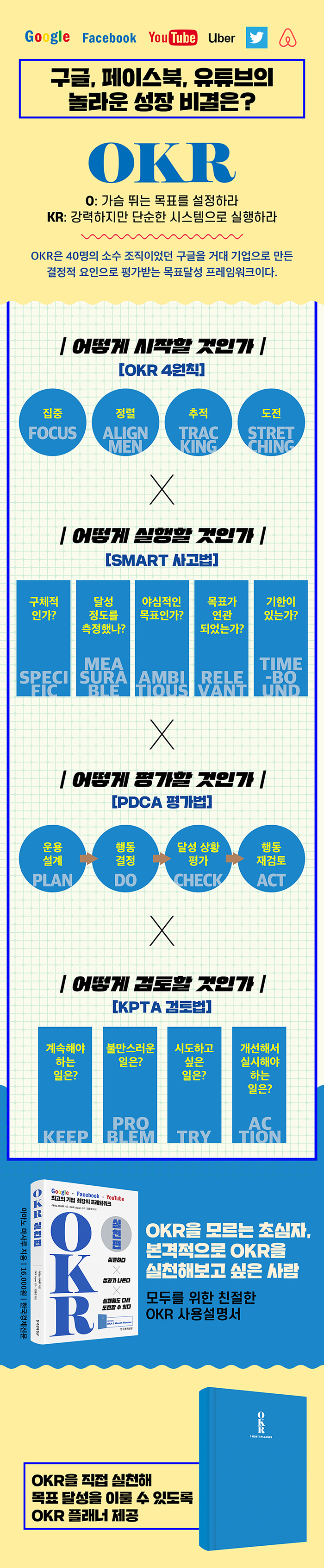 OKRÀº ¸ñÇ¥(Objective)¸¦ ¼³Á¤ÇÏ°í ±¸Ã¼ÀûÀÎ °á°ú ÁöÇ¥(Key Results)·Î À̸¦ ´Þ¼ºÇß´ÂÁö ÃøÁ¤Çϰí ÃßÀûÇØ³ª°¡´Â ¸ñÇ¥ ´Þ¼º¹ýÀÌ´Ù. ÁýÁß, Á¤·Ä, ÃßÀû, µµÀüÀ̶ó´Â OKR 4¿øÄ¢À¸·Î ¹æÇâÀ» ¼³Á¤Çϰí, SMART »ç°í¹ýÀ¸·Î °á°ú ÁöÇ¥¸¦ üũÇÑ´Ù. ´Þ¼º »óȲÀº PDCA Æò°¡¹ýÀ¸·Î µ¹¾Æº¸°í, KPTA °ËÅä¹ýÀ¸·Î ¼öÁ¤ ¹æÇâÀ» ¼³Á¤Çسª°¡¸é ´©±¸¶óµµ ¼³Á¤ÇÑ ¸ñÇ¥¸¦ ´Þ¼ºÇÏ°Ô µÈ´Ù.