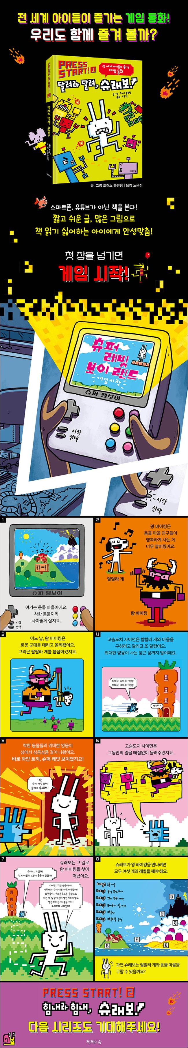 °ÔÀÓ°ú ºñÁÖ¾ó¿¡ Àͼ÷ÇÑ ¾ÆÀ̵鿡°Ô ÀÌ Ã¥Àº ¸¶Ä¡ °ÔÀÓÀ» ÇÏ´Â °Í°ú °°Àº ±âºÐÀ» ´À³¢¸é¼ ÀÐÀ» ¼ö ÀÖµµ·Ï ¸¸µé¾îÁ³´Ù. Ã¥À» º¸´Â °Í¸¸À¸·Îµµ °ÔÀÓÀ» ÇÏ´Â Àç¹Ì³ª, À¯Æ©¹öµéÀÇ À̾߱⸦ ¿µ»óÀ¸·Î º¸´Â °Í °°Àº Èï¹Ì·Î¿òÀ» ¸¸³£ÇÒ ¼ö ÀÖ´Ù. Ã¥ ¼Ó ÁÖÀΰø ¶ÇÇÑ °ÔÀÓÀ» ÇÏ´Â ¾ÆÀÌ¿Í °ÔÀÓ ¼Ó ij¸¯ÅÍÀÎ ¡®½´ÆÛ ·¡ºø º¸ÀÌ¡¯, ÁÙ¿©¼ ¡®½´·¡º¸¡¯ÀÇ »óȲÀ» ¿Ô´Ù °¬´Ù Çϴµ¥, ±× ºÎºÐÀÌ ´õ¿í °ø°¨ÀÌ µÇ¾î °ÔÀÓ °°Àº Ã¥ Àб⿡ ÁýÁßÇÏ°Ô ÇÑ´Ù. °Å±â¿¡ ¸¸Èó·³ ¸¹Àº ±×¸²°ú ª°í ½¬¿î ±Û·Î ±¸¼ºµÇ¾î, ºÐ·®ÀÌ Àִ å Àб⿡ µµÀüÇϰųª, ÀÌÁ¦ Á¶±Ý µ¶¼¿¡ È£±â½ÉÀ» °¡Áö·Á´Â ¾ÆÀ̵鿡°Ô ÀûÇÕÇÑ µ¿ÈÀÌ´Ù.