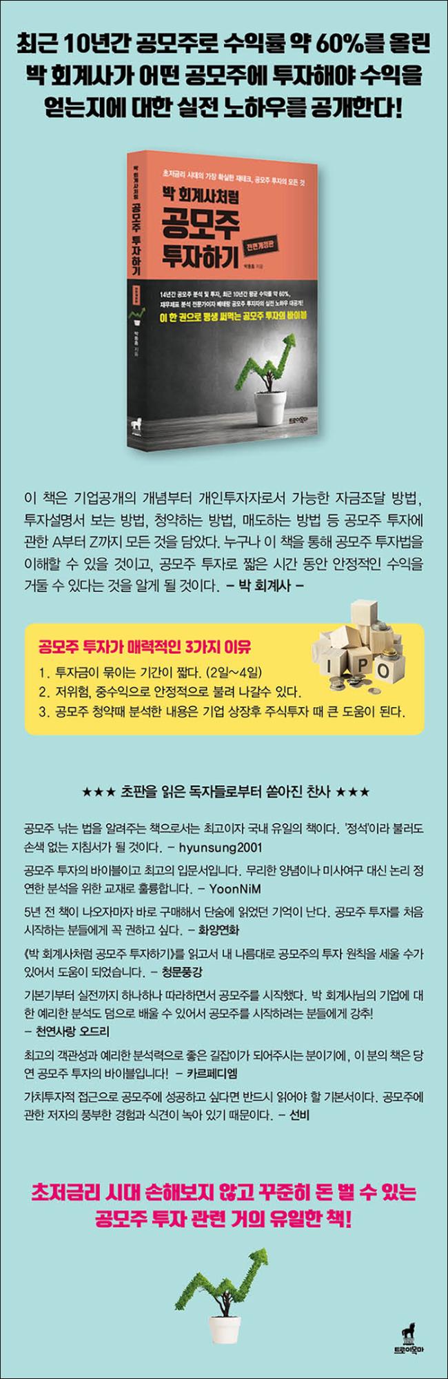 ÀÌ Ã¥Àº ±â¾÷°ø°³ÀÇ °³³äºÎÅÍ °³ÀÎÅõÀÚÀڷμ °¡´ÉÇÑ ÀÚ±ÝÁ¶´Þ ¹æ¹ý, ÅõÀÚ¼³¸í¼ º¸´Â ¹æ¹ý, û¾àÇÏ´Â ¹æ¹ý, ¸ÅµµÇÏ´Â ¹æ¹ý µî °ø¸ðÁÖ ÅõÀÚ¿¡ °üÇÑ AºÎÅÍ Z±îÁö ¸ðµç °ÍÀ» ´ã¾Ò´Ù. ´©±¸³ª ÀÌ Ã¥À» ÅëÇØ °ø¸ðÁÖ ÅõÀÚ¹ýÀ» ÀÌÇØÇÒ ¼ö ÀÖÀ» °ÍÀ̰í, °ø¸ðÁÖ ÅõÀڷΠªÀº ½Ã°£ µ¿¾È ¾ÈÁ¤ÀûÀÎ ¼öÀÍÀ» °ÅµÑ ¼ö ÀÖ´Ù´Â °ÍÀ» ¾Ë°Ô µÉ °ÍÀÌ´Ù.
