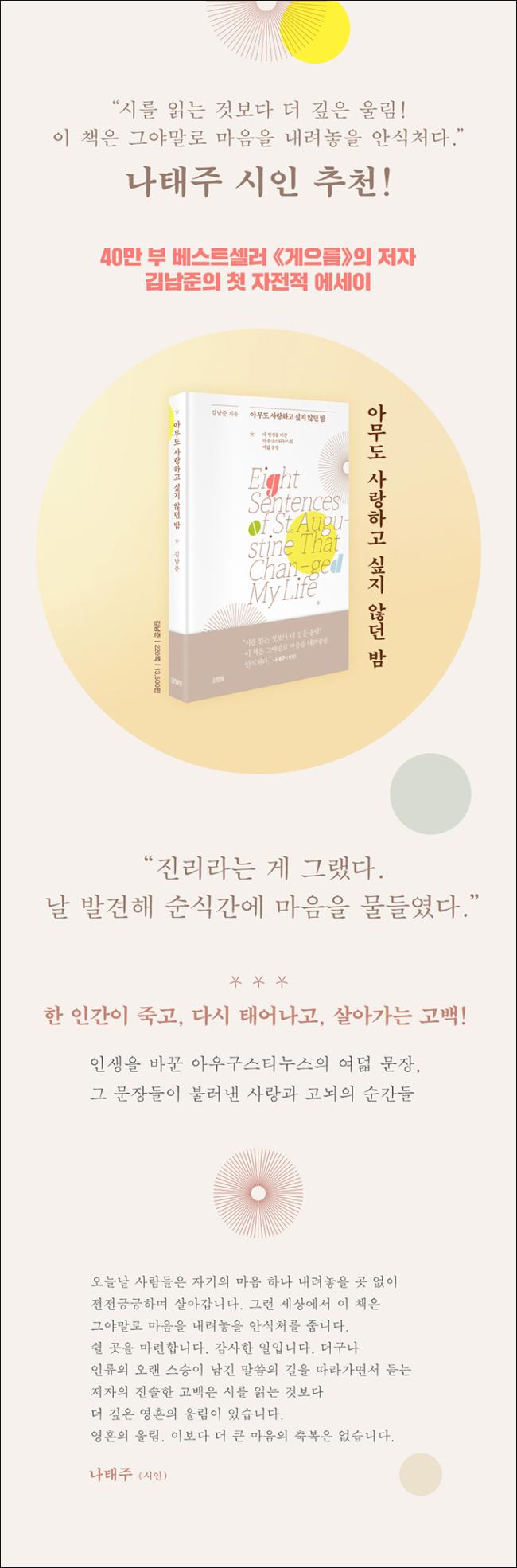 40¸¸ ºÎ º£½ºÆ®¼¿·¯¸¦ ±â·ÏÇÑ ¡¶°ÔÀ¸¸§¡· ¿Ü¿¡µµ, ¡¶±íÀÌ Àд Áֱ⵵¹®¡· ¡¶½ÅÇаøºÎ, ³ª´Â ÀÌ·¸°Ô ÇØ¿Ô´Ù¡· µî ±½Á÷ÇÑ ÀúÀÛÀ¸·Î ±âµ¶±³ ÃâÆÇ¿¡ ÇÑ È¹À» ±×Àº ±è³²ÁØ ¸ñ»çÀÇ Ã¹ ÀÚÀüÀû ¿¡¼¼ÀÌ. ±×°¡ ¿À·§µ¿¾È »ç¼÷Çß´ø öÇÐÀÚÀÌÀÚ ½ÅÇÐÀÚÀÎ ¾Æ¿ì±¸½ºÆ¼´©½º°¡ ³²±ä ±Û Áß¿¡¼ ±×ÀÇ ÀλýÀ» ¹Ù²Û ¿©´ü °³ÀÇ ¹®ÀåÀ» °ñ¶ó, ±×°£ ¸»ÇÏÁö ¾Ê¾Ò´ø ÀÚ½ÅÀÇ ³»¹ÐÇÑ À̾߱â, ±× »ç¶ûÇÏ°í °í³úÇß´ø ½Ã°£µé°ú ÇÔ²² ¿«¾î³Â´Ù. ¿¹±âÄ¡ ¾ÊÀº ÀλýÀÇ ¼ø°£¿¡ ¸¶ÁÖÄ£ ¹®Àå°ú ±ú´ÞÀ½À» ´ãÀº ÀÌ Ã¥Àº, ¾î¶»°Ô ÇÑ Àΰ£ÀÌ Á×°í, ´Ù½Ã ž°í, »ì¾Æ°¡´ÂÁö¸¦ º¸¿©ÁÖ´Â °í¹éÀÇ ±â·ÏÀ̱⵵ ÇÏ´Ù. ¾Æ¹«µµ »ç¶ûÇÏ°í ½ÍÁö ¾Ê´ø ¹ã, Ȧ·Î ÀÖ¾î ¿Ü·Ó°í µÎ·Á¿î ´ç½Å¿¡°Ô ÀÌ Ã¥À» ÀüÇÑ´Ù. ÀÛÀº ÃкÒÀ» ¹àÈ÷´Â ¸¶À½À¸·Î.