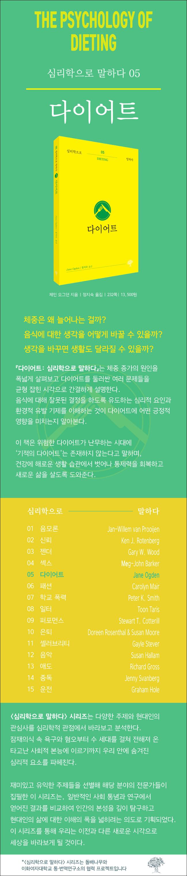 üÁßÀÌ Áõ°¡ÇÏ´Â ÀÌÀ¯´Â ÇÊ¿äÇÑ °Íº¸´Ù ¸¹ÀÌ ¸Ô°í ¿ì¸®°¡ ¸ÔÀº À½½ÄÀ» ´Ù ¼ÒºñÇÏ´Â µ¥ ÇÊ¿äÇÑ È°µ¿·®º¸´Ù Àû°Ô ¿òÁ÷À̱⠶§¹®ÀÌ´Ù. ´Ù½Ã ¸»ÇØ ¿ì¸®´Â °ú½ÄÇϰí Àû°Ô ¿òÁ÷ÀδÙ. ÀÌ´Â ½É¸®Àû ¿äÀΰú ȯ°æÀû À¯¹ß ±âÁ¦·Î ÀÎÇÑ °ÍÀÌ´Ù. ±×·¯¹Ç·Î ¸ðµç ´ÙÀÌ¾îÆ® ½Ãµµ´Â ȯ°æÀû À¯¹ß ±âÁ¦¸¦ °ü¸®ÇÒ ¼ö ÀÖµµ·Ï µµ¿ÍÁÖ´Â °ÍÀº ¹°·Ð ¿ì¸®ÀÇ »ý°¢À» ¹Ù²Ü ¼ö ÀÖ¾î¾ß ÇÑ´Ù. ½¬¿î ÀÏÀÌ ¾Æ´Ï´Ù! (¡¦) ¼¼°è´Â Á¡Á¡ üÁßÀÌ ºÒ¾î³ª±â´Â ½±°í ³¯¾ÀÇÔÀ» À¯ÁöÇϱâ´Â ¾î·Æµµ·Ï ¼³°èµÇ°í ÀÖ´Ù. ¶§¶§·Î ´ÙÀÌ¾îÆ®¶ó´Â ¼¼°è´Â ÁÁÀº °á°ú¸¦ °¡Á®¿À±âº¸´Ù´Â ÇØ¸¦ ³¢Ä¡´Â °æ¿ì°¡ ´õ ¸¹¾Ò´Ù. ÀÌ Ã¥ÀÇ ³»¿ëÀÌ ÀÌ µÎ ¼¼°èÀÇ Á¢Á¡À» ãÀ» ¼ö ÀÖ´Â °¡±³ ¿ªÇÒÀ» ÇÏ´Â ÇÑÆí º¸´Ù ±ÕÇü ÀâÈ÷°í Á¤º¸¿¡ ±Ù°ÅÇÑ ¹æ¹ýÀ» Á¦½ÃÇÒ ¼ö Àֱ⸦ Èñ¸ÁÇÑ´Ù.