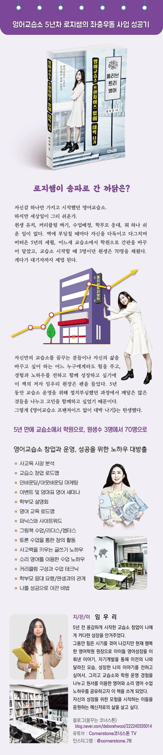 5³â Àü ¿ë°¨ÇÏ°Ô ½ÃÀÛÇÑ ±³½À¼Ò â¾÷ÀÌ ³ª¿¡°Ô Ä¿´Ù¶õ ¼ºÀåÀ» ¾È°ÜÁÖ¾ú´Ù. ±×µ¿¾È Èûµç ½Ã±â¸¦ °Þ¾î ³ª°¬Áö¸¸ ÇöÀç ÇູÇÑ ¿µ¾îÇпø ¿øÀåÀ¸·Î ¾ÆÀÌµé ¿µ¾î¼ºÀåÀ» ÀÌ·ï³½ À̾߱â, ÀÚ±â°è¹ßÀ» ÅëÇØ ÀÌÀüÀÇ ³ª¿Í ´Þ¶óÁø ¸ð½À, ¼ºÀåÇÑ ³ªÀÇ À̾߱⸦ ÀüÇÏ°í ½Í¾î¼, ±×¸®°í ±³½À¼Ò¿Í Çпø ¿î¿µ °æÇèÀ» ³ª´©°í ¿ø¼¸¦ ÀÌ¿ëÇÑ ¿µ¾î¿Í ¼Ò¸® ¿µ¾î ¼ö¾÷ ³ëÇϿ츦 °øÀ¯ÇϰíÀÚ ÀÌ Ã¥À» ¾²°Ô µÇ¾ú´Ù. ÀÚ½ÅÀÇ ¼ºÀåÀ» À§ÇÑ ¸ðÇèÀ» ½ÃÀÛÇÏ´Â À̵éÀ» ÀÀ¿øÇÏ´Â ¸Þ½ÅÀú·ÎÀÇ »îÀ» »ì°í ½Í´Ù.