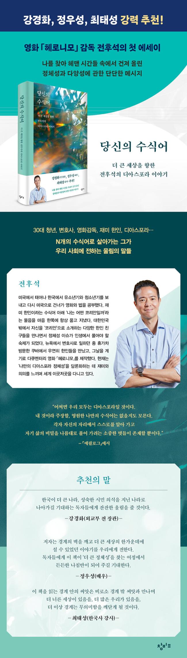 30´ë û³â, º¯È£»ç, ¿µÈ°¨µ¶, Àç¹Ì ÇÑÀÎ, µð¾Æ½ºÆ÷¶ó... N°³ÀÇ ¼ö½Ä¾î·Î »ì¾Æ°¡´Â ÀüÈļ®ÀÌ ¿ì¸® »çȸ¿¡ ÀüÇÏ´Â ¿ï¸²ÀÇ ¸»µé.¡º´ç½ÅÀÇ ¼ö½Ä¾î¡»´Â 30´ë û³â, º¯È£»ç, ¿µÈ°¨µ¶, Àç¹Ì ÇÑÀÎ, µð¾Æ½ºÆ÷¶ó µî ¿©·¯ °³ÀÇ ¼ö½Ä¾î¸¦ °¡Áø ÀúÀÚ°¡ ÀÚ½ÅÀÇ Á¤Ã¼¼ºÀ» ã¾Æ°¡´Â ºû³ª´Â ¿©Á¤¿¡ °üÇÑ À̾߱âÀÌ´Ù. ÀúÀÚ ÀüÈļ®Àº ¹Ì±¹¿¡¼ ž 3»ì ¶§ Çѱ¹À¸·Î ¿Í¼ û¼Ò³â±â¸¦ º¸³»°í ´Ù½Ã ¹Ì±¹À¸·Î °¡ ¿µÈ¿Í ¹ýÀ» °øºÎÇÑ Àç¹Ì ÇÑÀÎÀÌ´Ù. ¹Ì±¹ ÄÚÆ®¶ó(KOTRA)¿¡¼ º¯È£»ç·Î ÀÏÇÏ´ø ±×´Â ÈÞ°¡Â÷ ¶°³ Äí¹Ù¿¡¼ ¿ì¿¬È÷ ¡®Çì·Î´Ï¸ð¡¯¶ó´Â Àι°À» ¾Ë°Ô µÇ°í, ±× ±æ·Î ¿µÈÀÇ ¼¼°è·Î ¶Ù¾îµç´Ù.