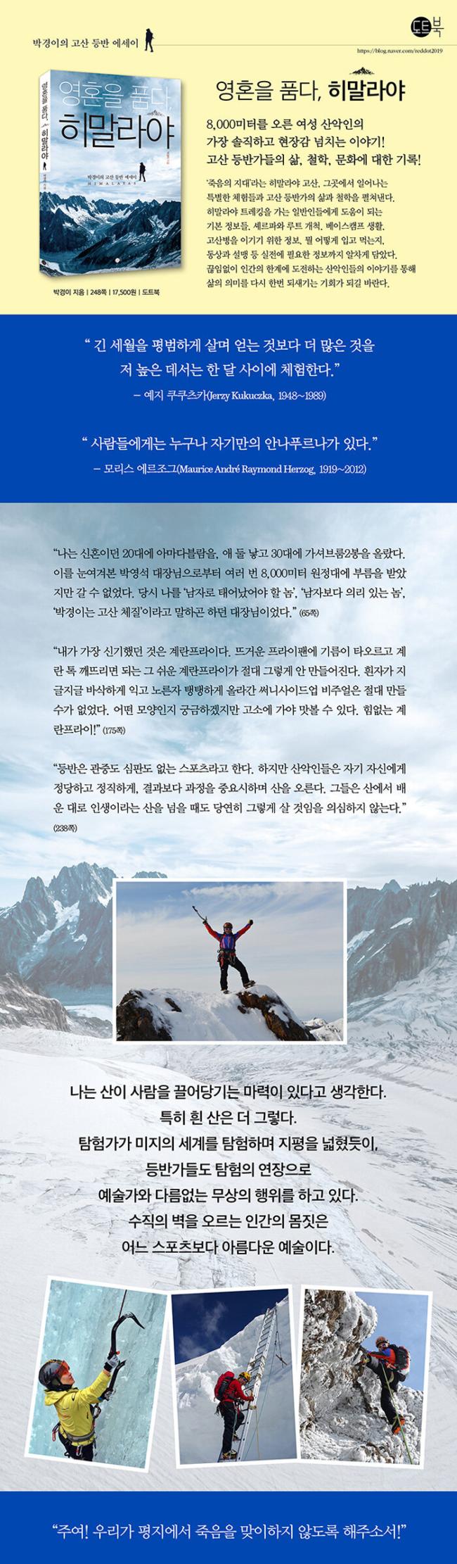 ³ª¸¶½º¶¼! 8,000m¸¦ ¿À¸¥ ¿©¼º »ê¾ÇÀÎ ¹Ú°æÀÌÀÇ ¶Ç ´Ù¸¥ µµÀü¿¡ Âù»ç¸¦ º¸³À´Ï´Ù. ³»ºÎÀÚÀÌÀÚ ¿¬±¸ÀÚÀÇ ½Ã¼±À¸·Î Á×À½ÀÇ Áö´ë¸¦ ¿À¸£´Â ¼±ÈĹè, µ¿·áµé, ±Ã±ØÀûÀ¸·Î´Â ±×³à Àڽſ¡ ´ëÇÑ ¼ºÂûÀ» ´ãÀº Ã¥ÀÔ´Ï´Ù. È÷¸»¶ó¾ßÀÇ ¿µÈ¥ÀÌ µÈ ¾Ç¿ì(äÀéÒ)µéµµ ¹Ú¼ö¸¦ º¸³¾ °Í °°½À´Ï´Ù. - ¾öÈ«±æ (»ê¾ÇÀÎ)