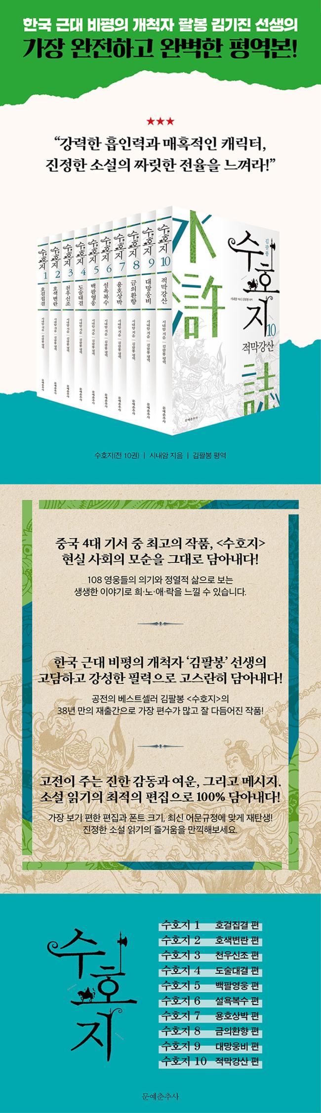 ¡º¼öÈ£Áö¡»´Â Áß±¹ ºÏ¼Û½Ã´ë ¾ç»ê¹Ú¿¡¼­ ºÀ±âÇß´ø È£°ÉµéÀÇ ½ÇÈ­¸¦ ¹è°æÀ¸·Î °¢»öµÈ, ¿ª»çÀû »ç½ÇÀ» ¸ðƼºê·Î ÀÛ°¡ÀÇ »ó»ó·ÂÀÌ °¡¹ÌµÈ ¿ª»ç¼Ò¼³ÀÌ´Ù. ¡º¼öÈ£Áö¡»ÀÇ 108 ¿µ¿õµéÀÇ Àι° ¹¦»ç, ¼¼Å dzÀÚ´Â ³Ê¹«µµ Àý½ÇÇϰí ÀýÀýÇÏ´Ù. ÇÊÄ¡´Â °ÅÄ¥Áö¾ðÁ¤ ±× ¹ß¶öÇÑ ¹®ÀåÀÇ ±â¼¼¿Í Ç¥ÇöÀº Áö±ÝÀÇ ¼Ò¼³°ú´Â ºñ±³ÇÒ ¼ö ¾ø´Â »ýµ¿°¨À¸·Î °¡µæÇÏ´Ù.