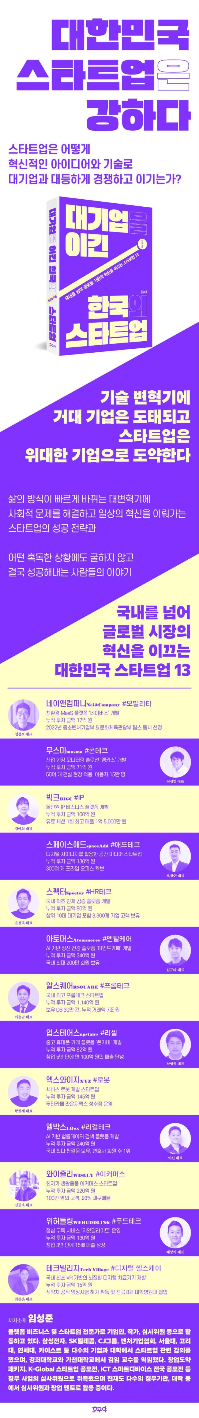 Ç÷§Æû ºñÁî´Ï½º ¹× ½ºÅ¸Æ®¾÷ Àü¹®°¡·Î ±â¾÷ÀÎ, ÀÛ°¡, ½É»çÀ§¿ø µîÀ¸·Î Ȱµ¿Çϰí ÀÖ´Ù. °í·Á´ëÇб³ ¾ð·Ð´ëÇпø¿¡¼ Á¤º¸Åë½ÅÀ» Àü°øÇß°í 2002³âºÎÅÍ 2014³â±îÁö ¾ßÈÄ, īī¿À, ³×À̹ö µî¿¡¼ ´Ù¾çÇÑ »ç¾÷À» ¼öÇàÇϸç ÀÎÅÍ³Ý Æ÷ÅÐÀÇ ¼º°ø ½ÅÈ¿Í ÇÔ²²Çß´Ù. 2015³âºÎÅÍ ÇöÀç±îÁö µÎ °³ÀÇ ½ºÅ¸Æ®¾÷À» â¾÷ÇÏ¿© ¾à 400¾ï ¿øÀÇ ÅõÀÚ À¯Ä¡¸¦ ¹Þ¾ÒÀ¸¸ç 2019³â¿¡´Â Áö½Ä ¼ºñ½º »ê¾÷ À¶ÇÕ ¹ßÀü¿¡ ±â¿©ÇÑ °ø·Î¸¦ ÀÎÁ¤¹Þ¾Æ »ê¾÷Åë»óÀÚ¿øºÎ Àå°ü»óÀ» ¼ö»óÇß´Ù. »ï¼ºÀüÀÚ, SKÅÚ·¹ÄÞ, CJ±×·ì, º¥Ã³±â¾÷Çùȸ, ¼¿ï´ë, °í·Á´ë, ¿¬¼¼´ë, Ä«À̽ºÆ® µî ´Ù¼öÀÇ ±â¾÷°ú ´ëÇп¡¼ ½ºÅ¸Æ®¾÷ °ü·Ã °ÀǸ¦ ÇßÀ¸¸ç, °æÈñ´ëÇб³¿Í °¡Ãµ´ëÇб³¿¡¼ °âÀÓ ±³¼ö¸¦ ¿ªÀÓÇß´Ù. â¾÷µµ¾àÆÐŰÁö, K-Global ½ºÅ¸Æ®¾÷ °ø¸ðÀü, ICT ½º¸¶Æ®µð¹ÙÀ̽º Àü±¹ °ø¸ðÀü µî Á¤ºÎ »ç¾÷ÀÇ ½É»çÀ§¿øÀ¸·Î À§Ã˵ÆÀ¸¸ç ÇöÀçµµ ´Ù¼öÀÇ Á¤ºÎ±â°ü, ´ëÇÐ µî¿¡¼ ½É»çÀ§¿ø°ú â¾÷ ¸àÅä·Î Ȱµ¿Çϰí ÀÖ´Ù. ½ºÅ¸Æ®¾÷À» ÁغñÇϰųª â¾÷ ÀÌÈÄ ¾î·Á¿òÀ» °Þ´Â ÈĹè â¾÷Àڵ鿡°Ô ½ÇÁúÀûÀÎ µµ¿òÀ» ÁÖ´Â ¸àÅä°¡ µÇ´Â °ÍÀÌ ÀλýÀÇ ¸ñÇ¥ Áß ÇϳªÀ̸ç À̸¦ ½ÇõÇϱâ À§ÇØ ¿©ÀüÈ÷ ÇöÀå¿¡¼ ¶Ù¸ç Ä¡¿ÇÏ°Ô »ì¾Æ°¡°í ÀÖ´Ù. Àú¼·Î´Â ¡¶Çѱ¹ÀÇ ½ºÅ¸Æ®¾÷ Çõ½ÅÀ» Çõ½ÅÇÏ´Â ¹ý¡· ¡¶½ºÅ¸Æ®¾÷ ¾ÆÀÌÅÛ ¹ß±¼ºÎÅÍ ÅõÀÚ À¯Ä¡±îÁö¡· µîÀÌ ÀÖ´Ù.
